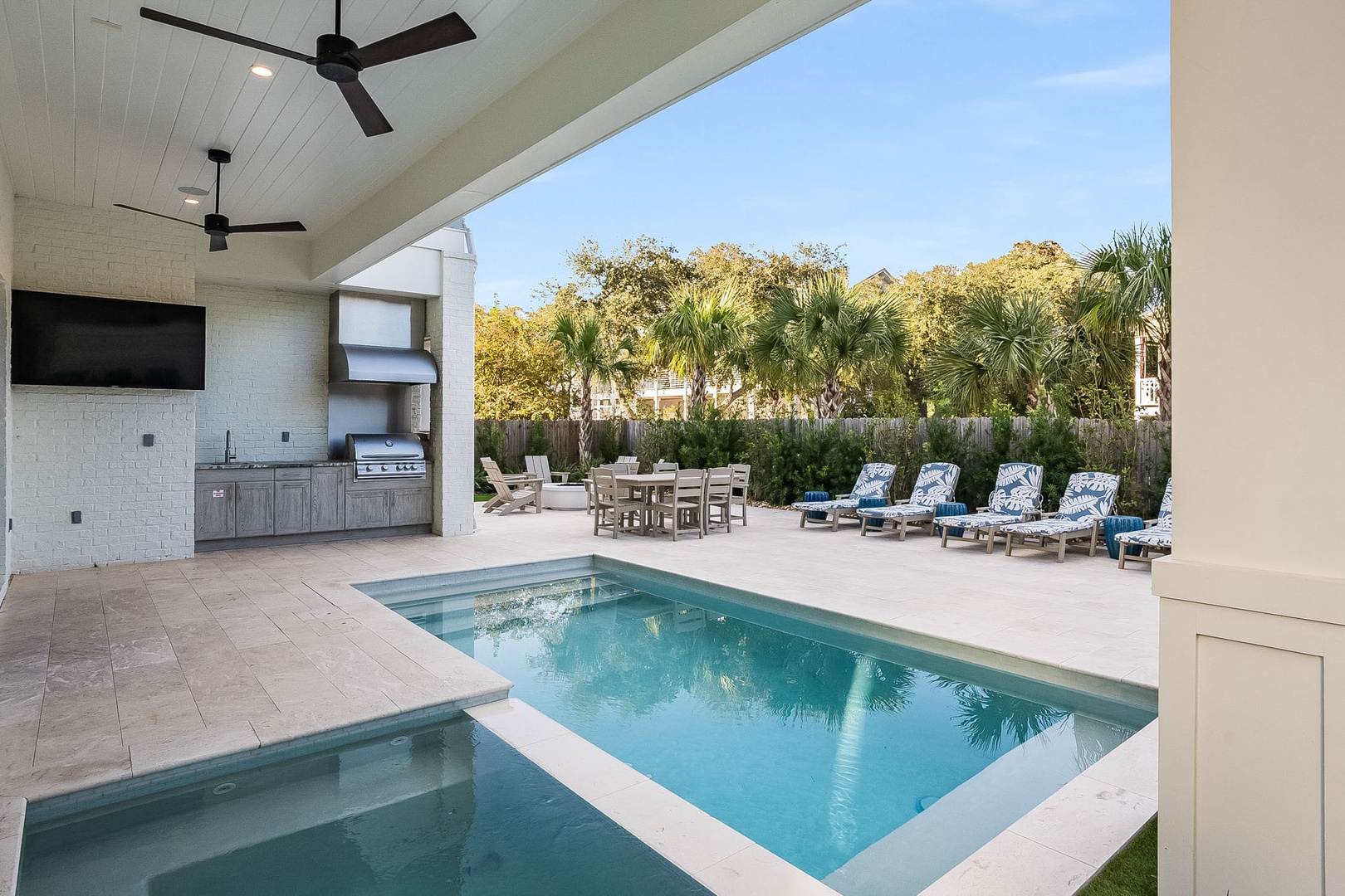 Upon arrival, guests are greeted by a charming front porch adorned with Adirondack chairs, setting the tone for this exceptional 3-story home. On the ground floor, two guest bedrooms provide comfort and privacy, while the expansive game room is a haven for entertainment. The game room is equipped with arcade-style pinball machines, a shuffleboard table, a wet bar complete with an ice maker and mini-fridge, and a cozy seating area featuring two large-screen TVs and plush furnishings. A sliding glass door opens to a beautifully designed backyard oasis. The tiled deck surrounds the private pool and sitting spa, where guests can unwind in front of a 65-inch outdoor TV. The outdoor kitchen, fitted with a gas grill, and the gas firepit encircled by comfortable chairs create the ideal setting for year-round alfresco dining and relaxation.