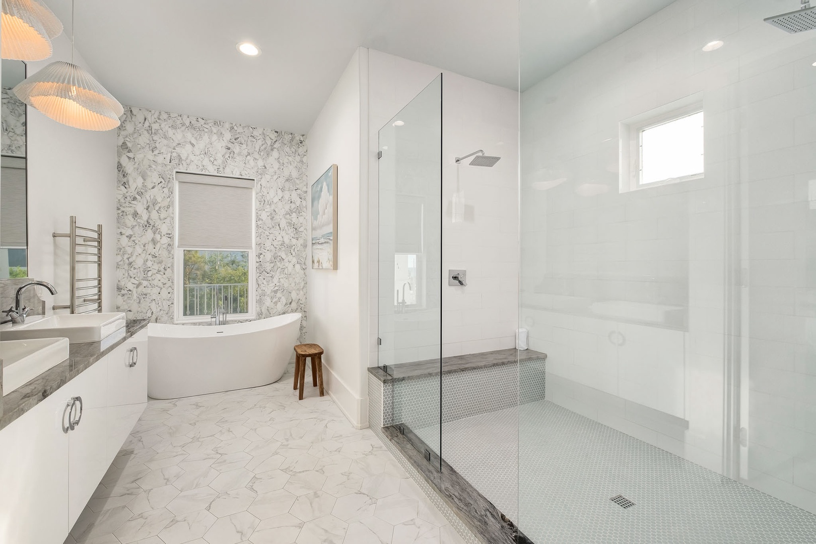 • Bedroom 1: Primary Guest Suite (sleeps 2): King Bed and Ensuite Bathroom with Double Vanities, Soaking Tub & Walk-in Tile Glass Shower