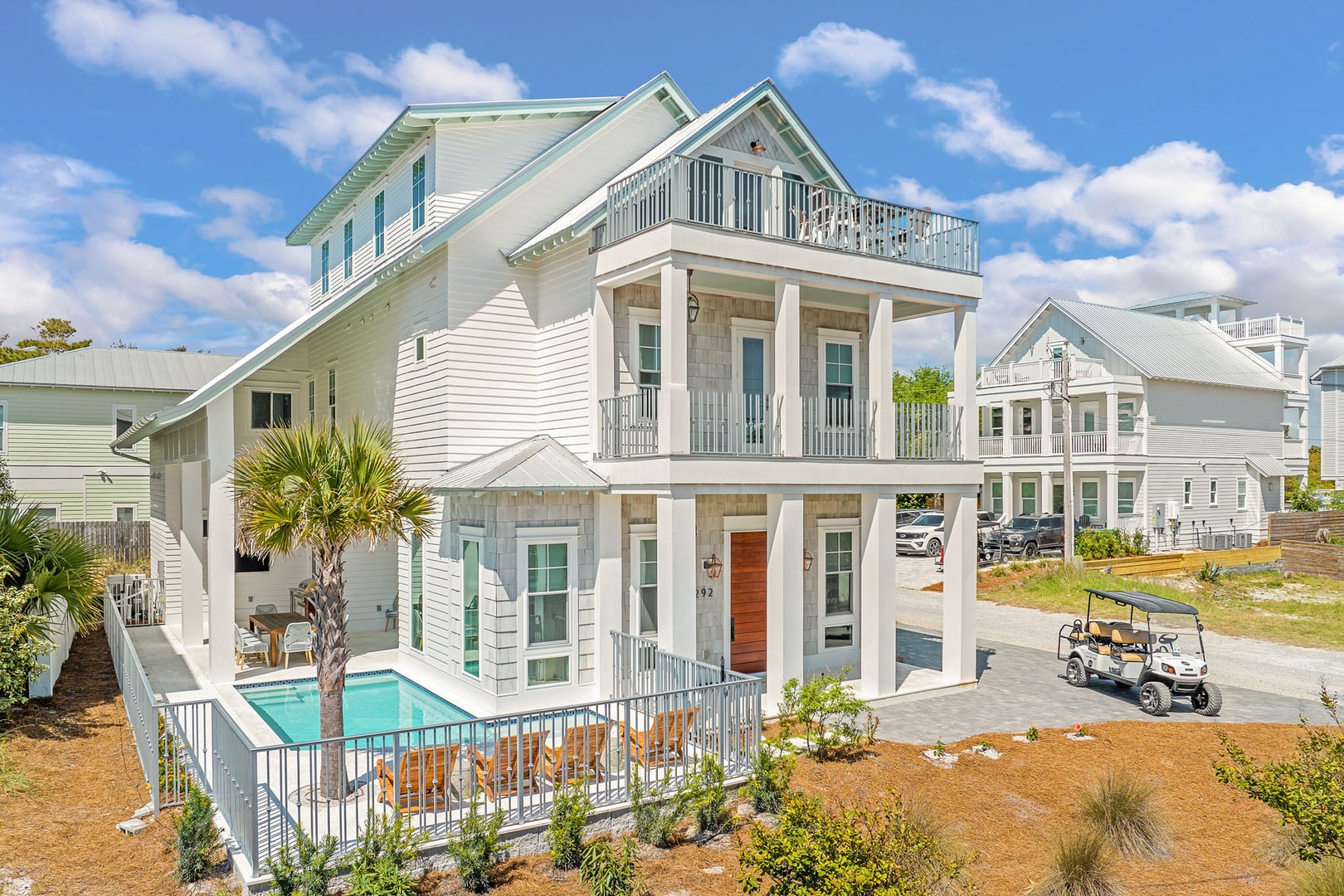 Step inside Coastal Dream, and you'll be welcomed by colorful interiors that reflect a fun, trendy vibe, making this home feel as lively as it is luxurious. The spacious open-concept layout features multiple living areas designed for relaxation and entertainment, with the heart of the home being the chef’s kitchen, which flows seamlessly into the living and dining spaces. Outside, enjoy the sun in style with a heated private pool and a fully equipped summer kitchen, ideal for poolside cookouts and evening gatherings. The home also includes a six-seater golf cart for easy trips to the beach and nearby attractions, as well as six bikes for exploring the charming streets of Seagrove Beach.