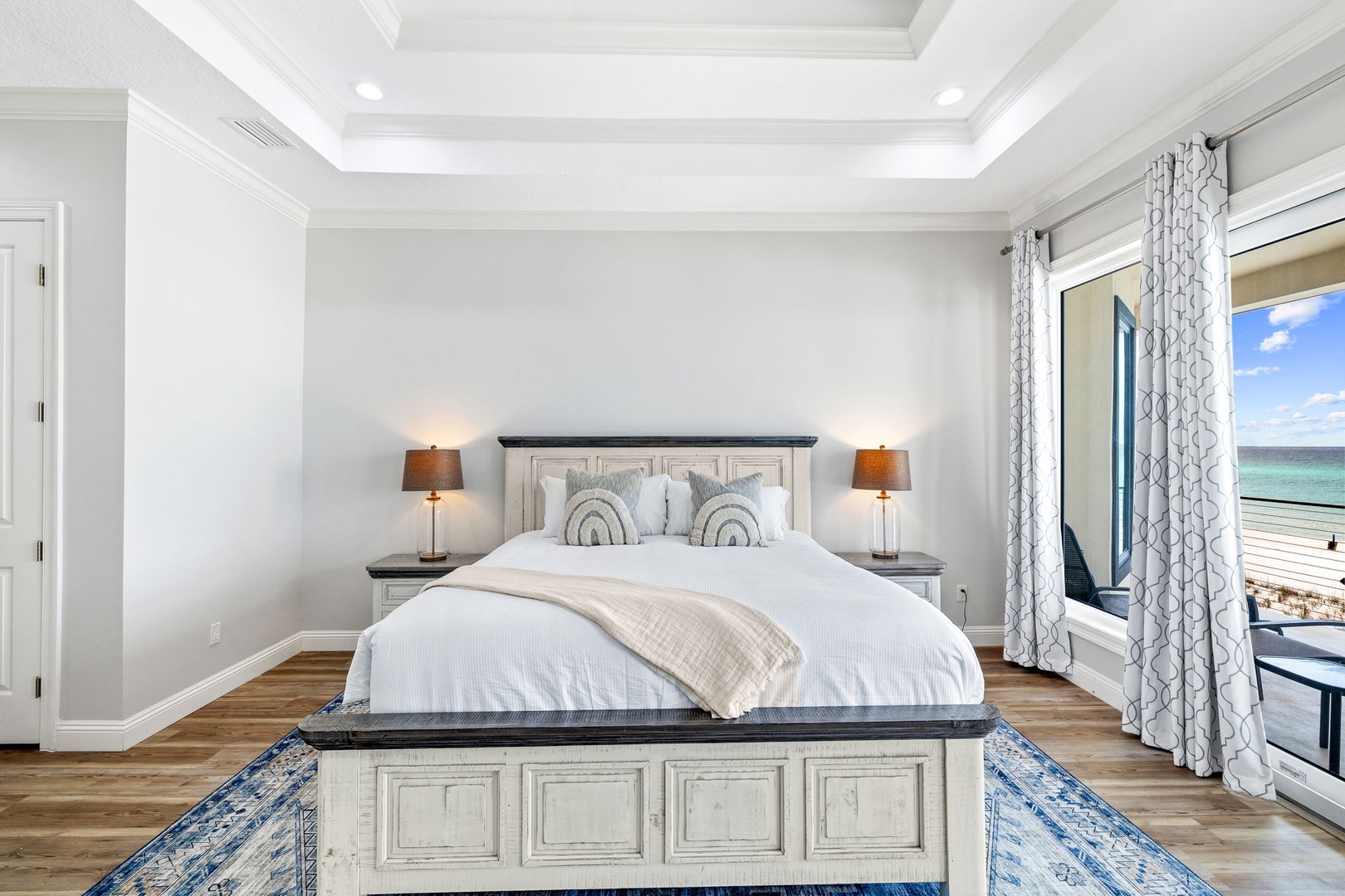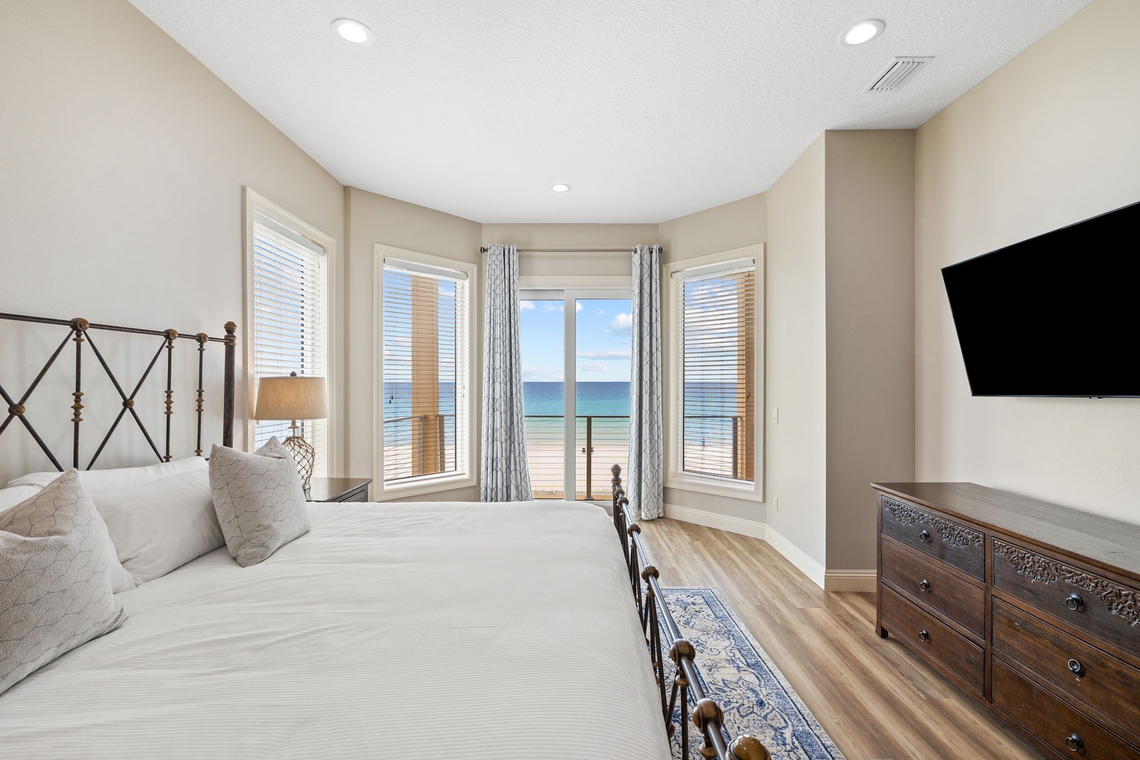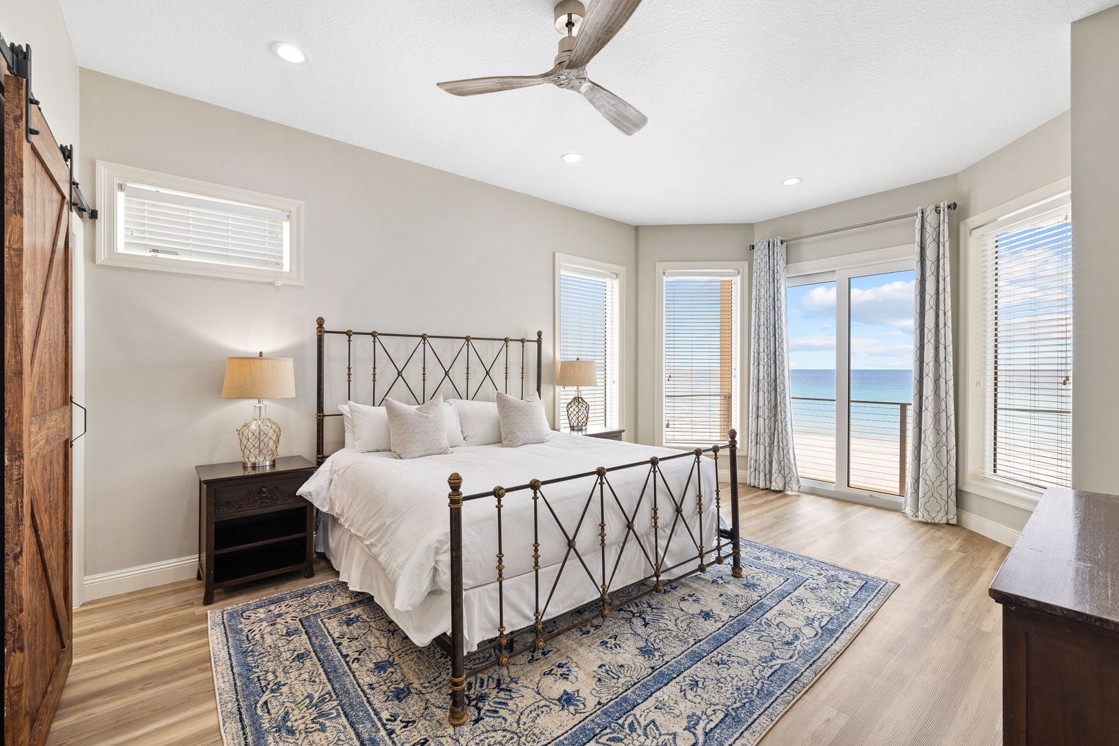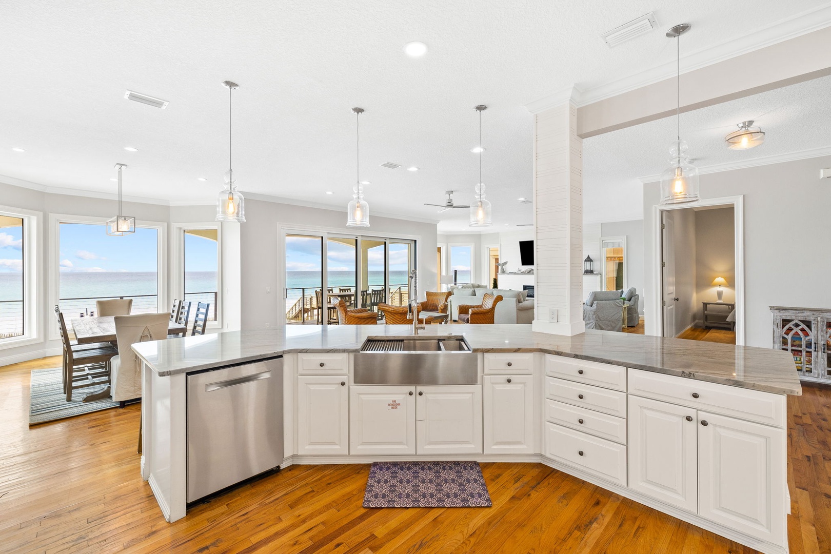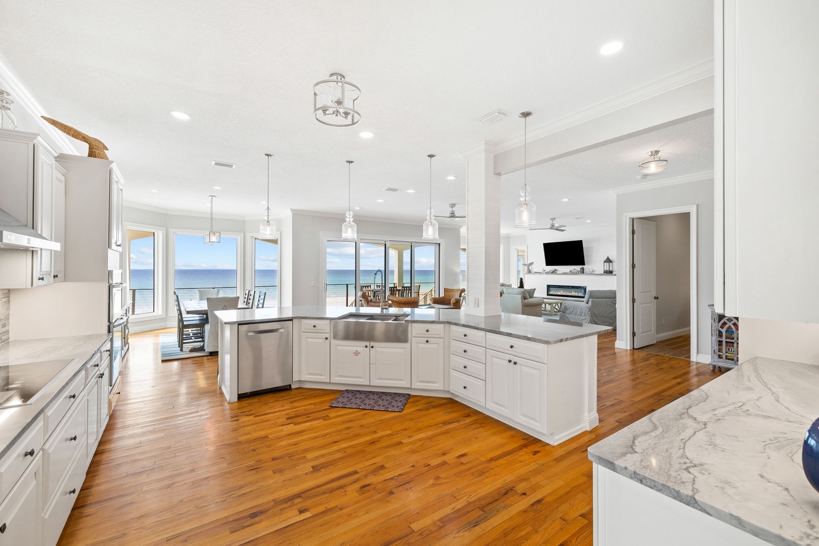 Nearby, the open ultramodern kitchen is well appointed with custom cabinetry, modern range hood, high-end stainless steel appliances, and an endless granite countertop with bar stool seating for five which creates the perfect spot for enjoying an adult beverage paired with tasty local seafood offerings. The first of this home’s two King Suites with private luxury bath featuring a soaker tub and walk-in shower is found on this level. In addition, designers have included a powder room/half bath and laundry on this floor for added convenience.