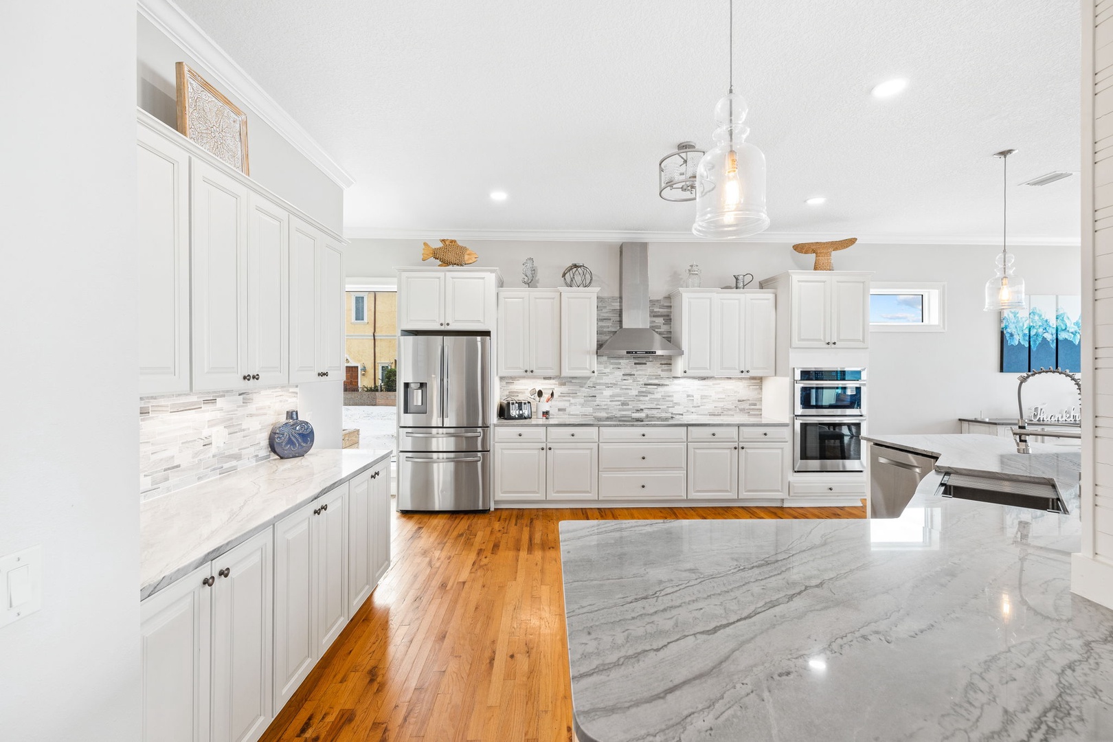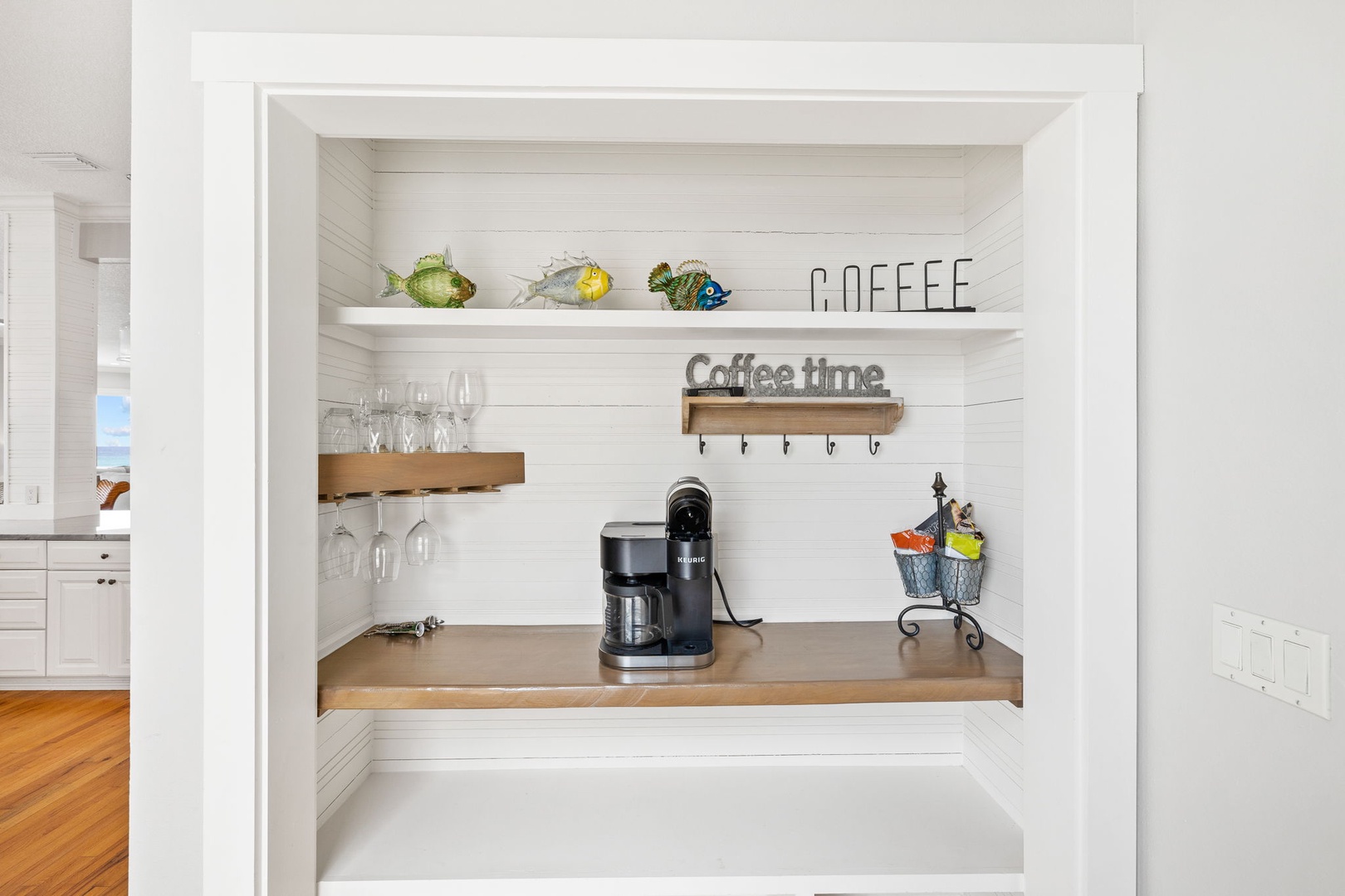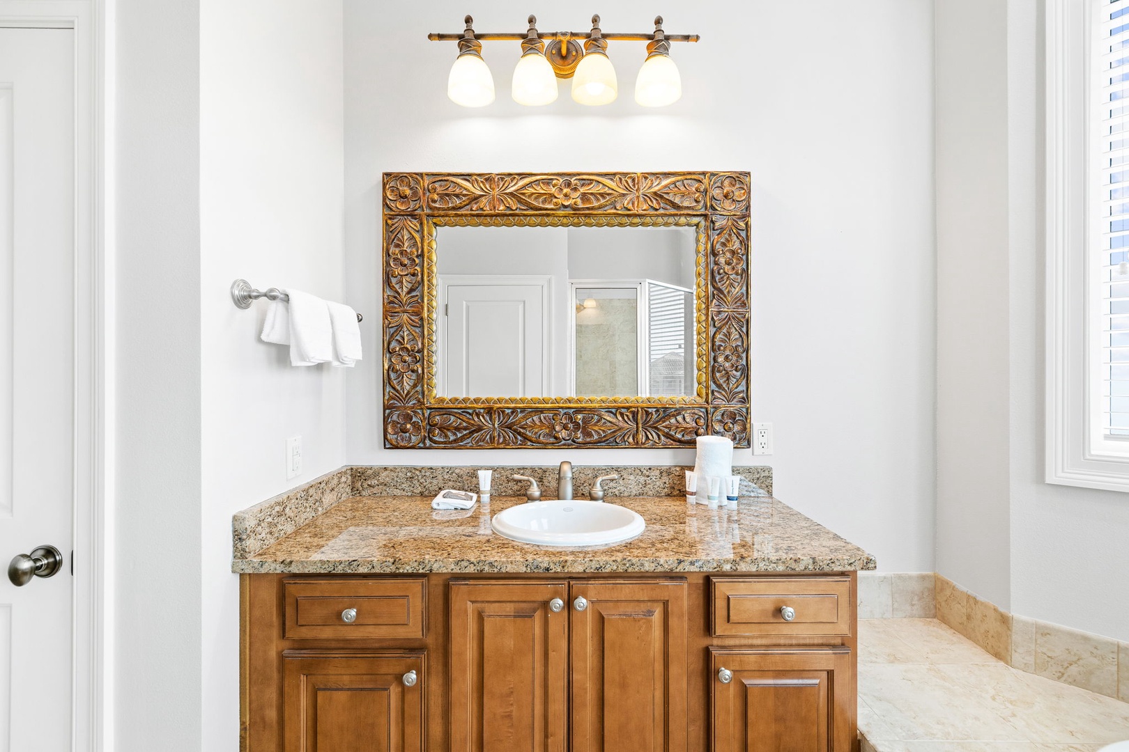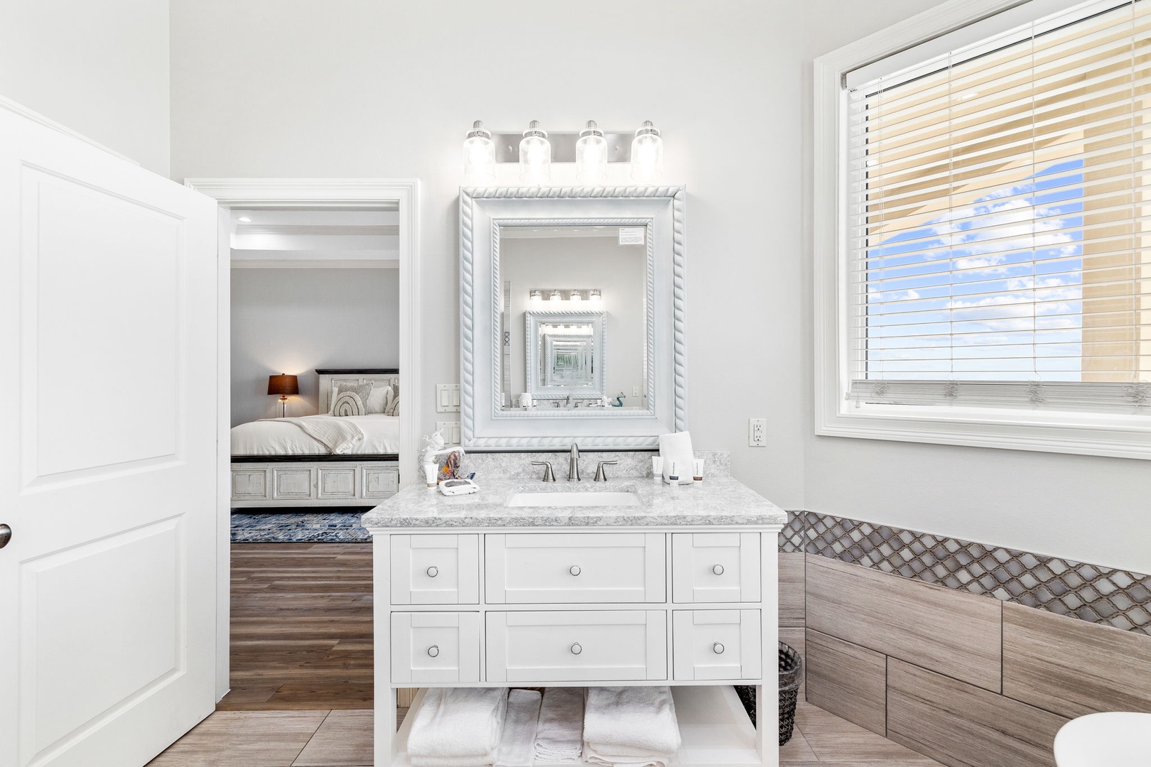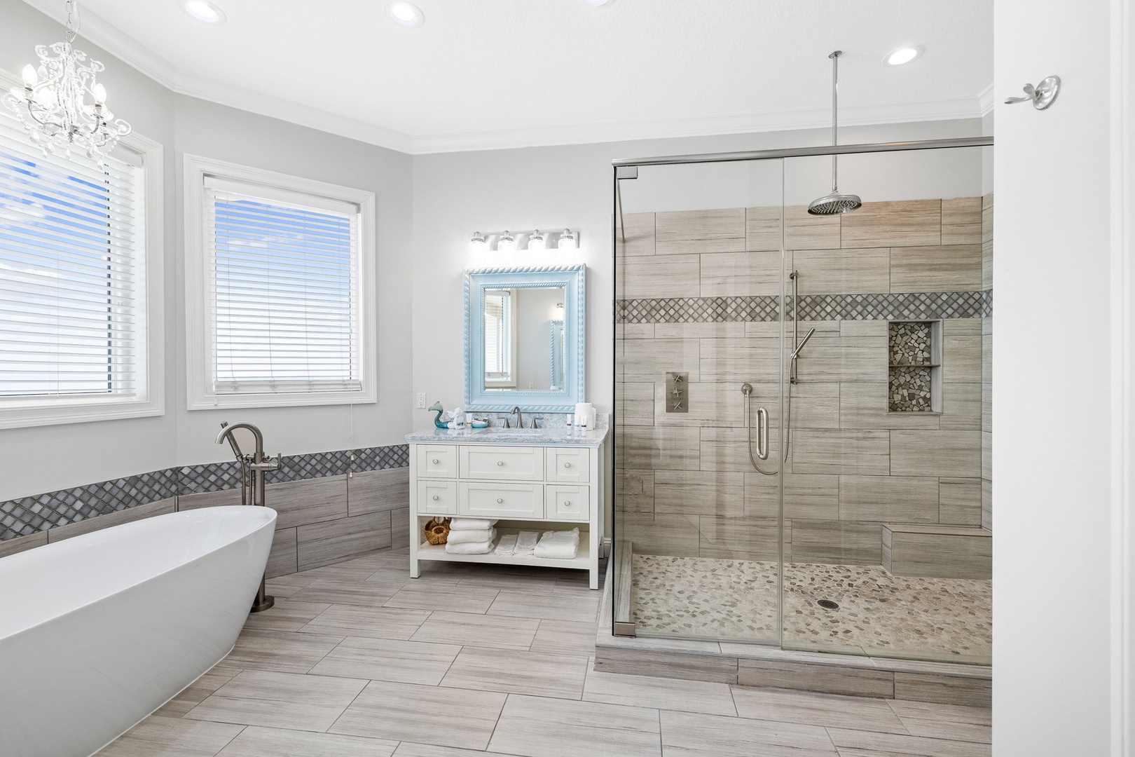 Nearby, the open ultramodern kitchen is well appointed with custom cabinetry, modern range hood, high-end stainless steel appliances, and an endless granite countertop with bar stool seating for five which creates the perfect spot for enjoying an adult beverage paired with tasty local seafood offerings. The first of this home’s two King Suites with private luxury bath featuring a soaker tub and walk-in shower is found on this level. In addition, designers have included a powder room/half bath and laundry on this floor for added convenience.