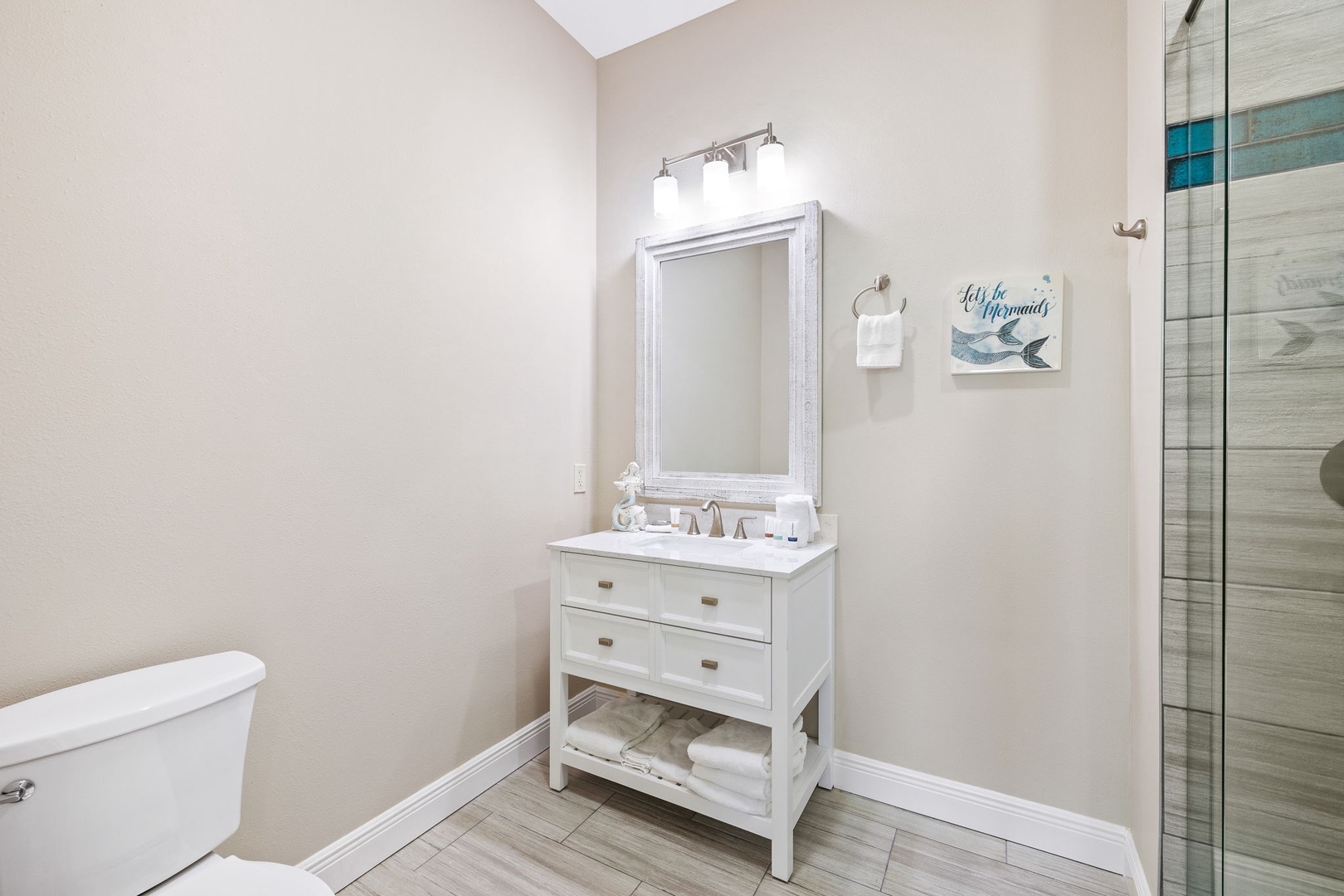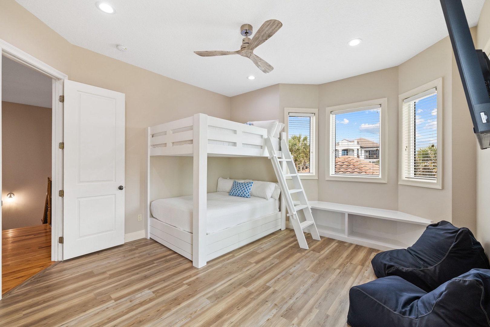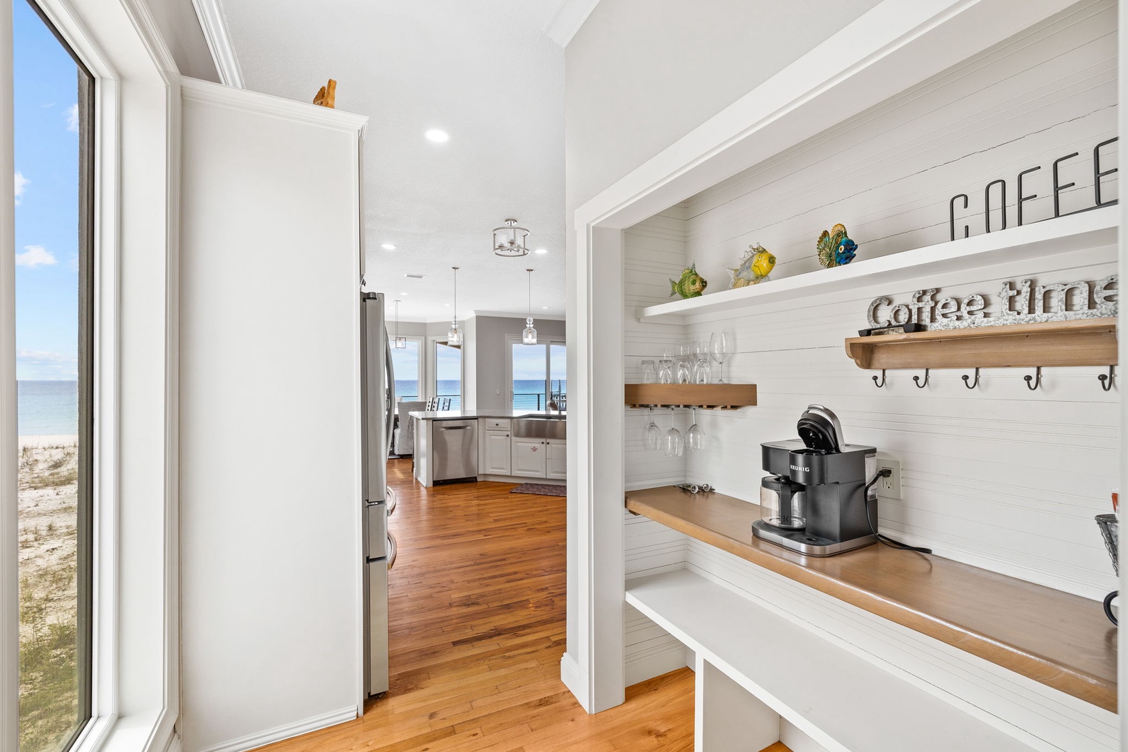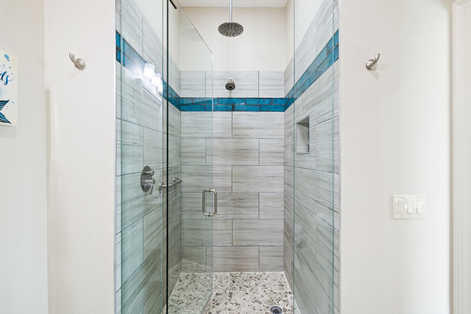 Nearby, the open ultramodern kitchen is well appointed with custom cabinetry, modern range hood, high-end stainless steel appliances, and an endless granite countertop with bar stool seating for five which creates the perfect spot for enjoying an adult beverage paired with tasty local seafood offerings. The first of this home’s two King Suites with private luxury bath featuring a soaker tub and walk-in shower is found on this level. In addition, designers have included a powder room/half bath and laundry on this floor for added convenience.
