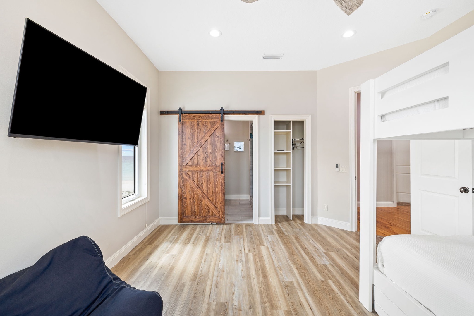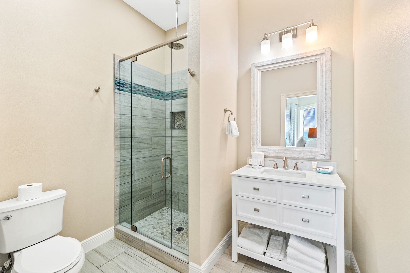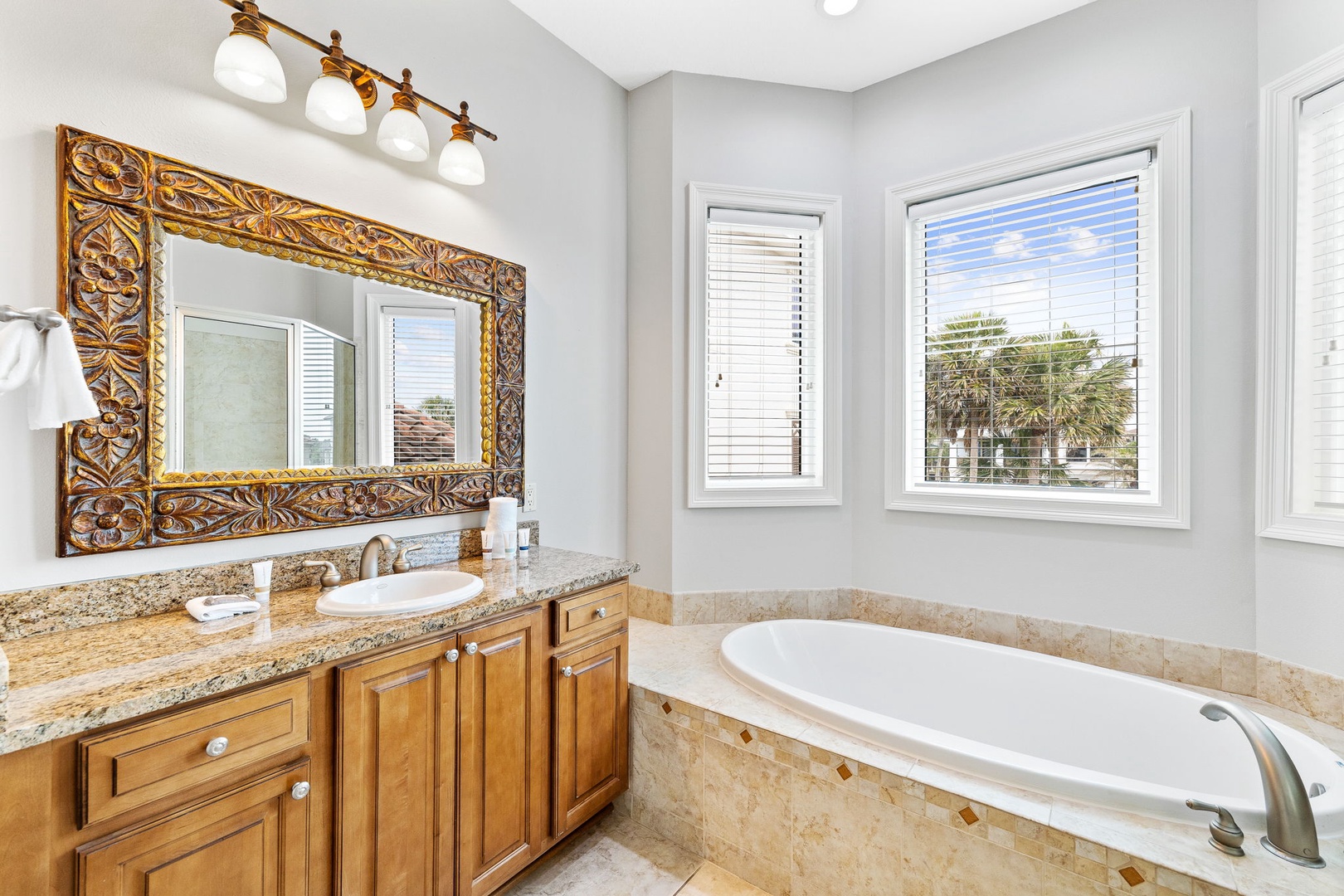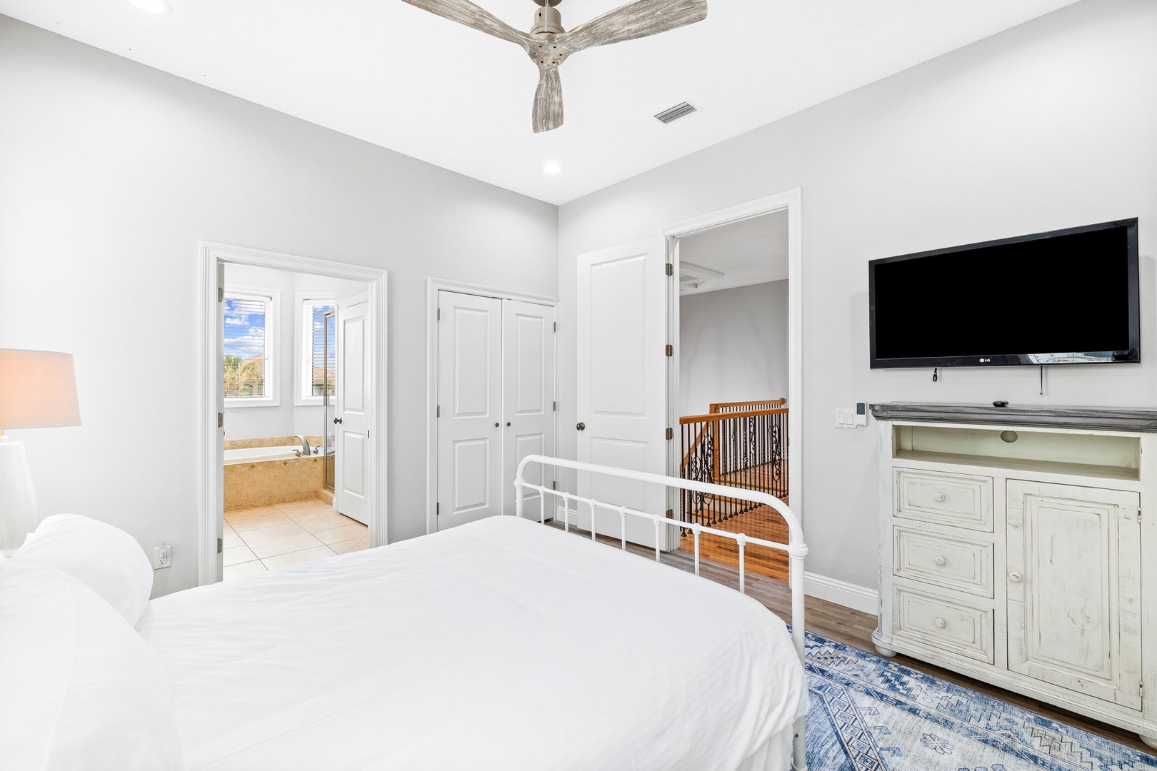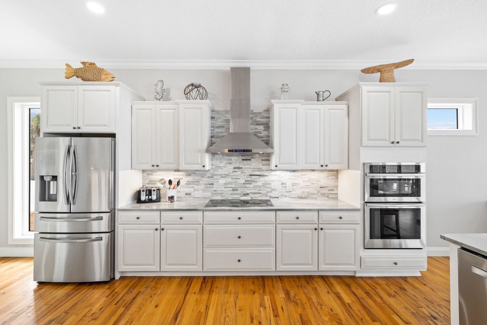 Nearby, the open ultramodern kitchen is well appointed with custom cabinetry, modern range hood, high-end stainless steel appliances, and an endless granite countertop with bar stool seating for five which creates the perfect spot for enjoying an adult beverage paired with tasty local seafood offerings. The first of this home’s two King Suites with private luxury bath featuring a soaker tub and walk-in shower is found on this level. In addition, designers have included a powder room/half bath and laundry on this floor for added convenience.