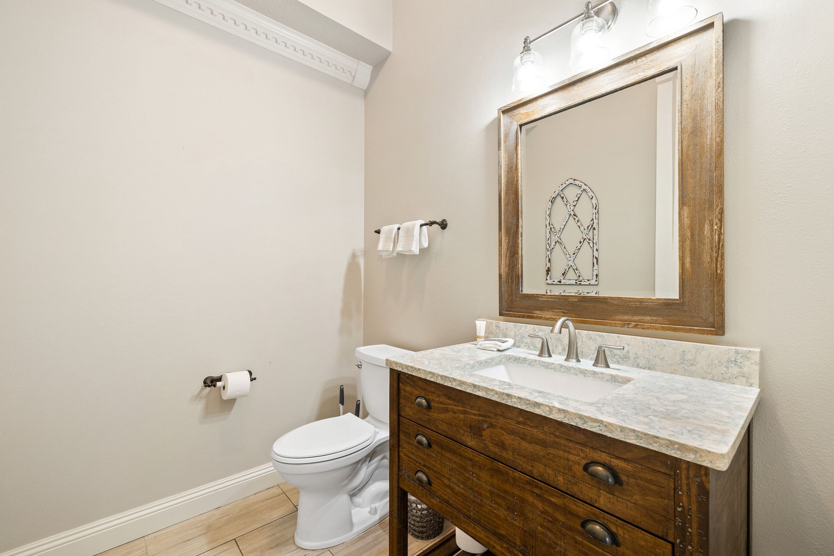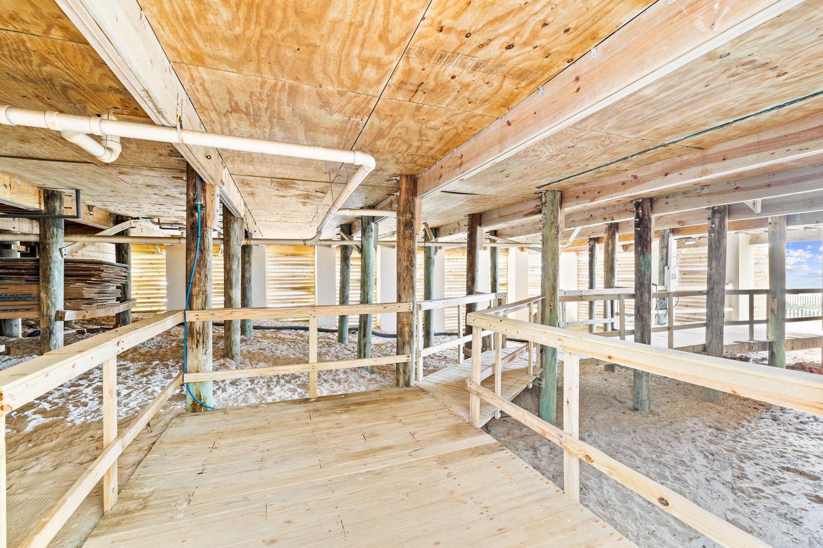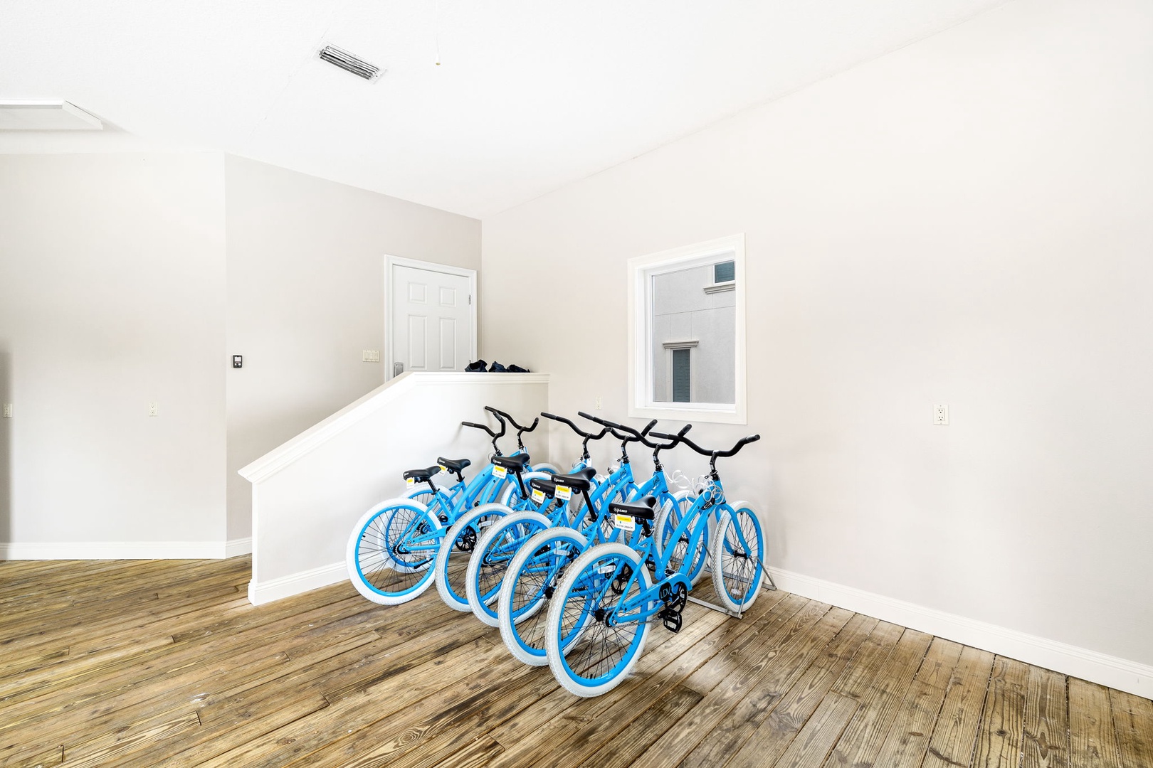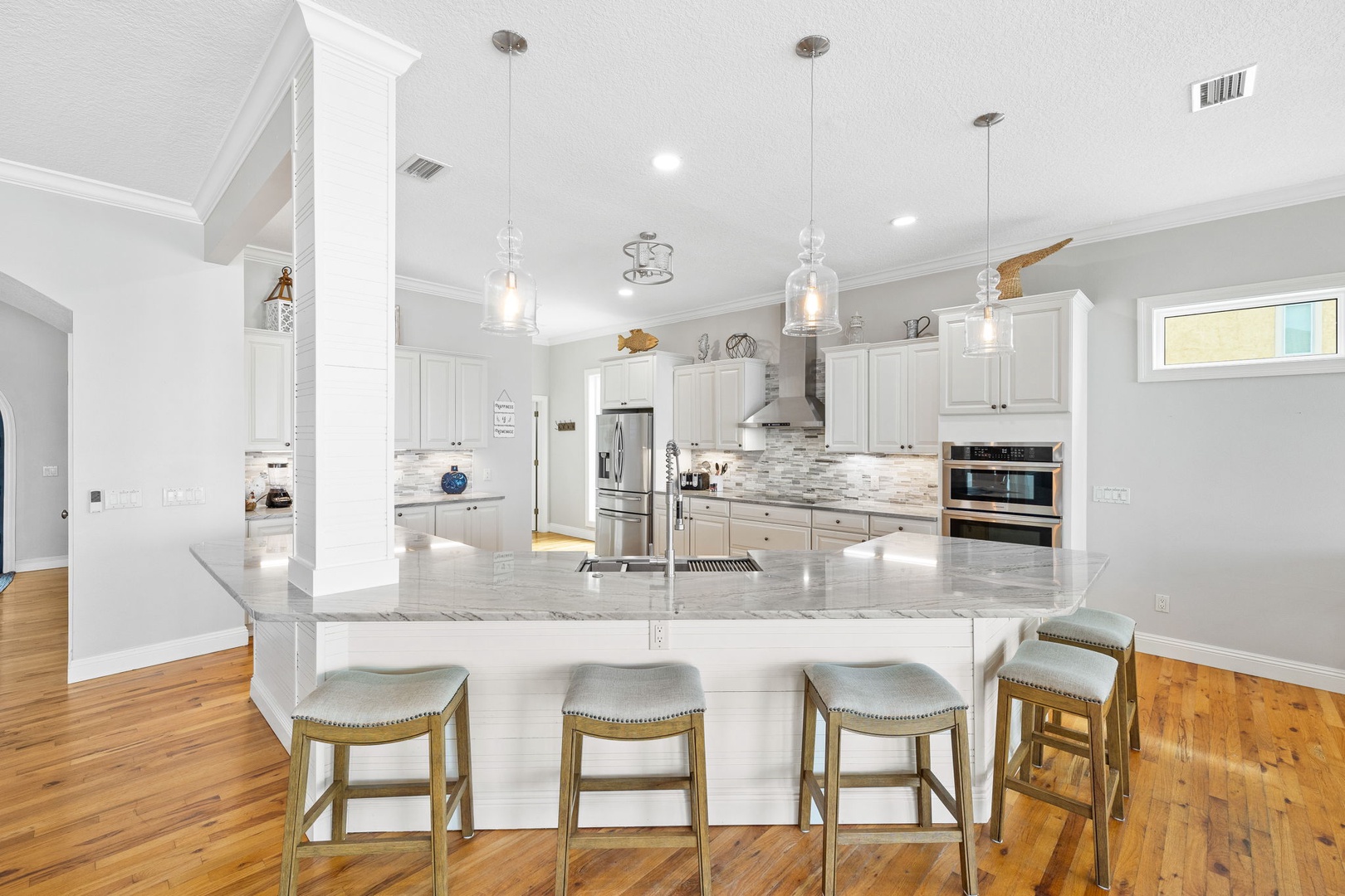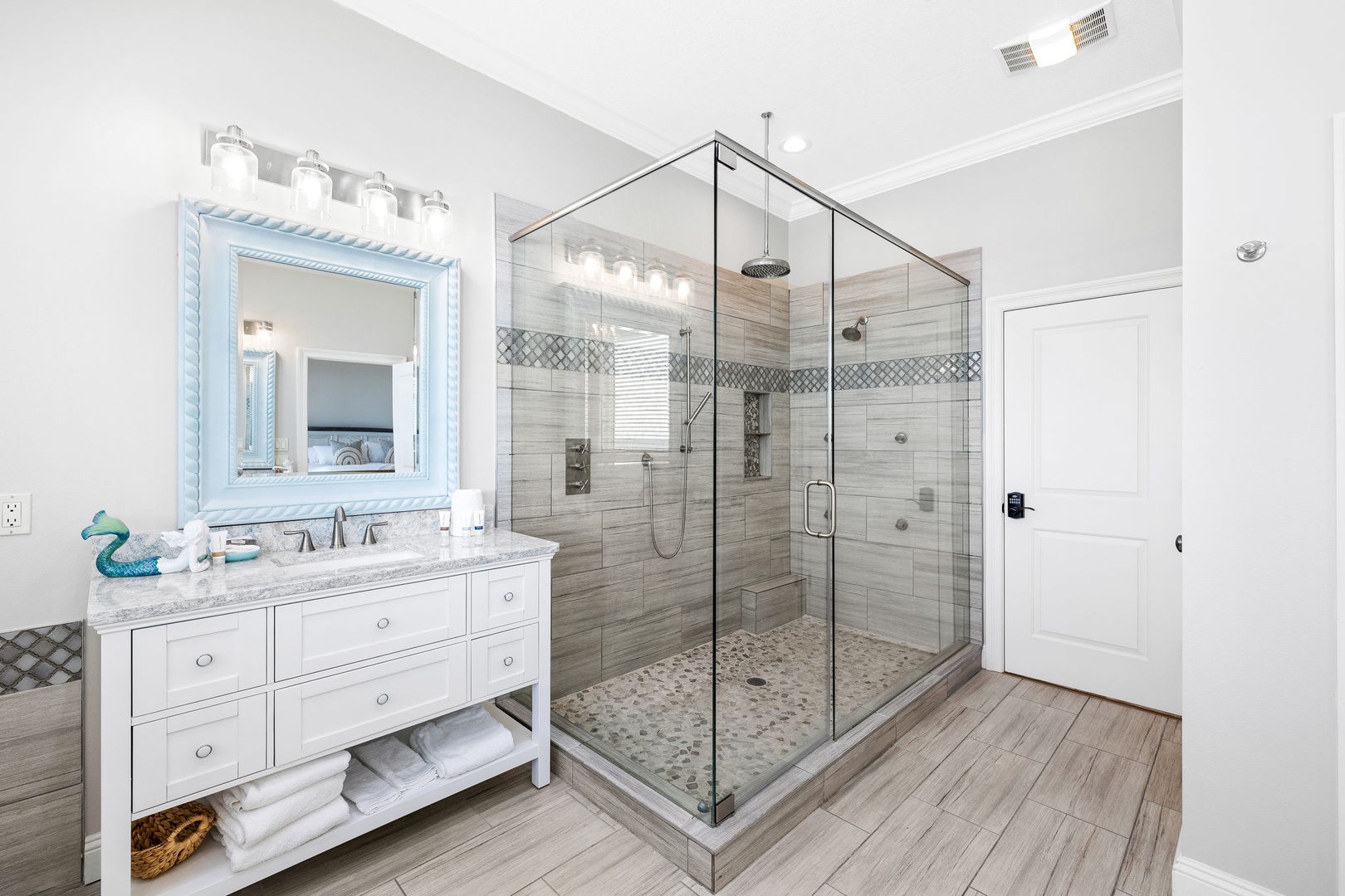 Nearby, the open ultramodern kitchen is well appointed with custom cabinetry, modern range hood, high-end stainless steel appliances, and an endless granite countertop with bar stool seating for five which creates the perfect spot for enjoying an adult beverage paired with tasty local seafood offerings. The first of this home’s two King Suites with private luxury bath featuring a soaker tub and walk-in shower is found on this level. In addition, designers have included a powder room/half bath and laundry on this floor for added convenience.