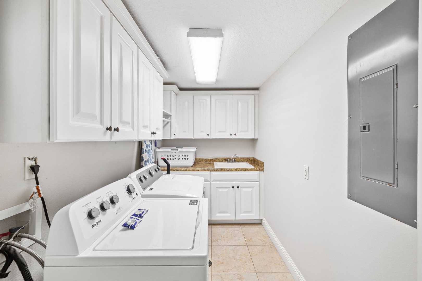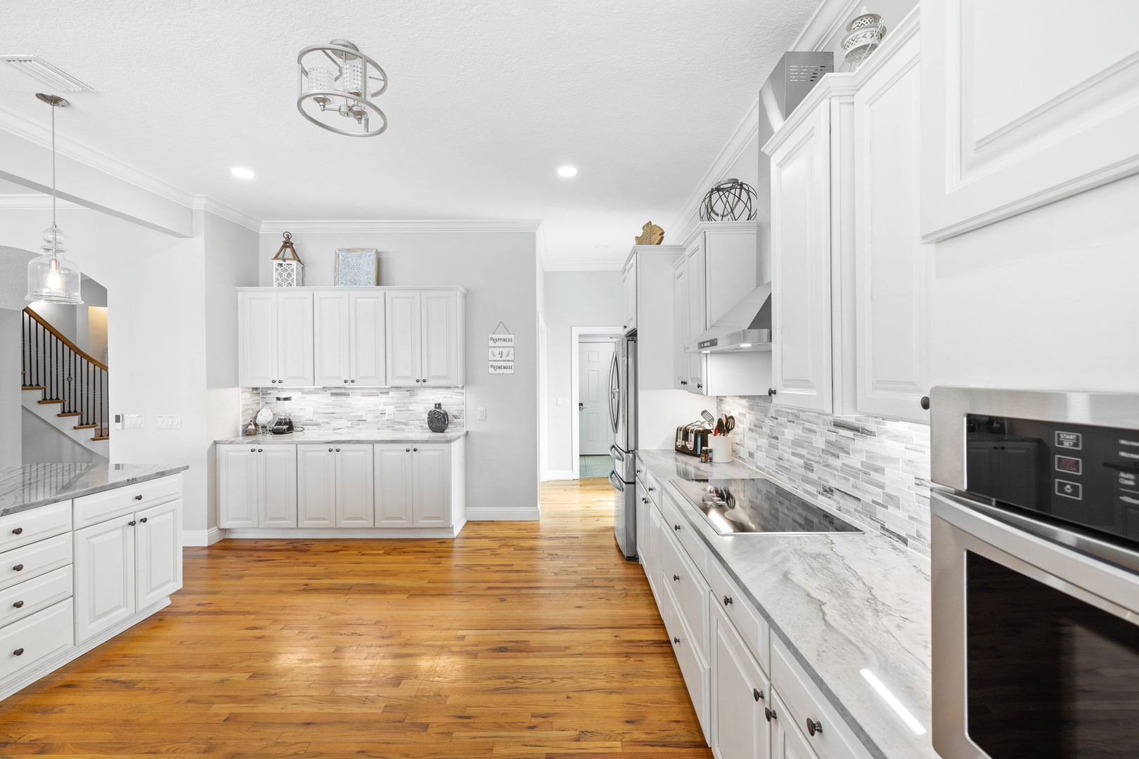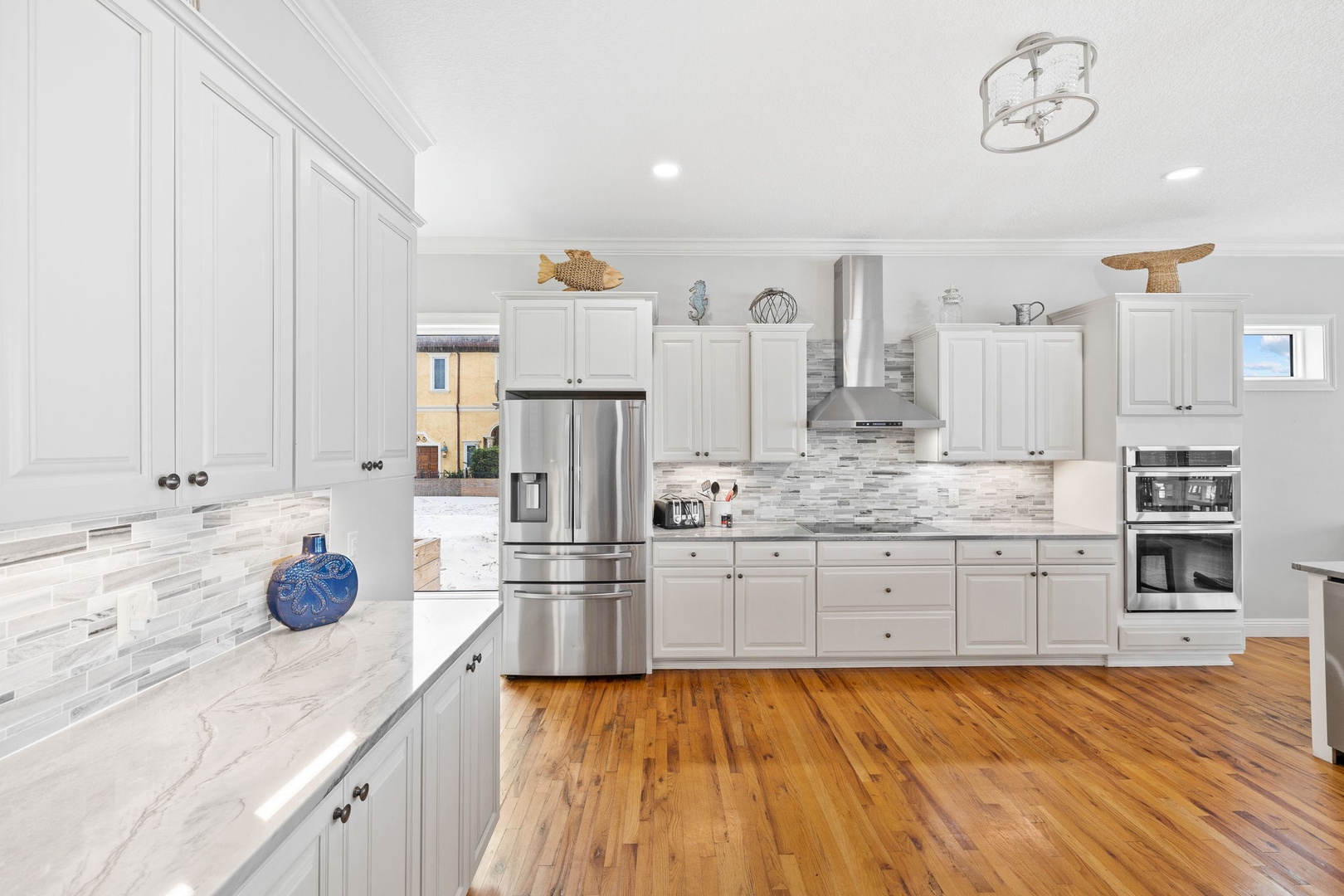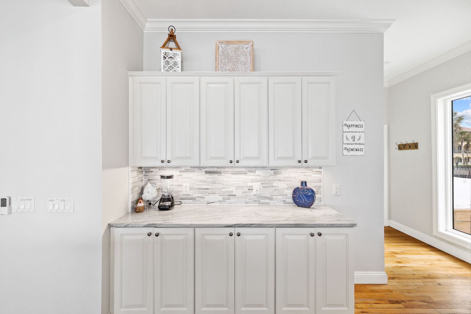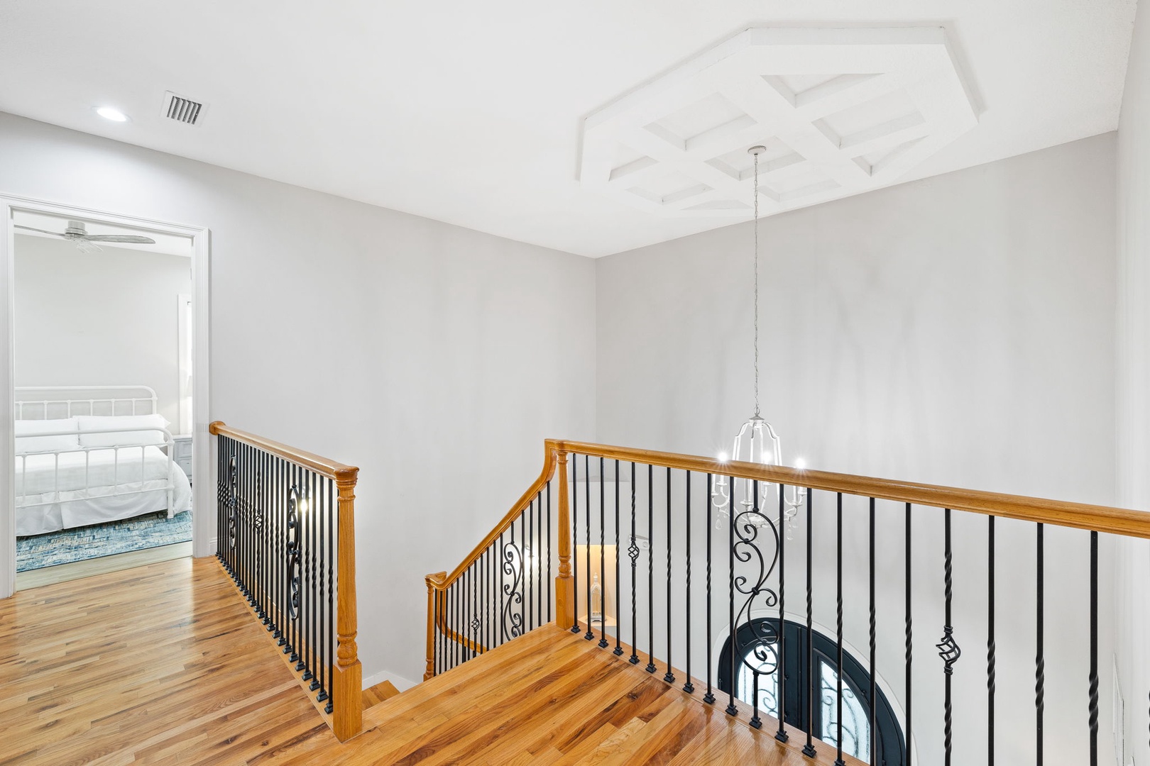 Nearby, the open ultramodern kitchen is well appointed with custom cabinetry, modern range hood, high-end stainless steel appliances, and an endless granite countertop with bar stool seating for five which creates the perfect spot for enjoying an adult beverage paired with tasty local seafood offerings. The first of this home’s two King Suites with private luxury bath featuring a soaker tub and walk-in shower is found on this level. In addition, designers have included a powder room/half bath and laundry on this floor for added convenience.