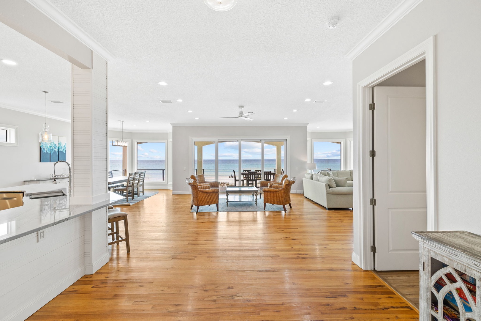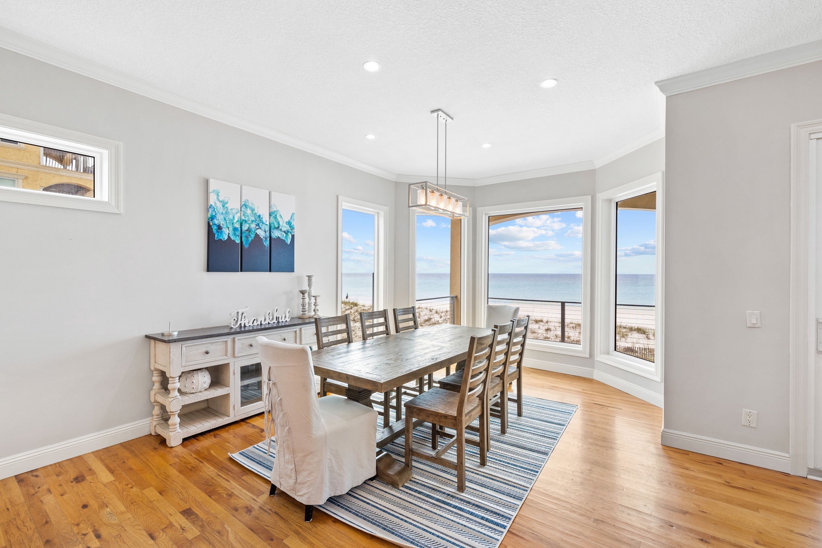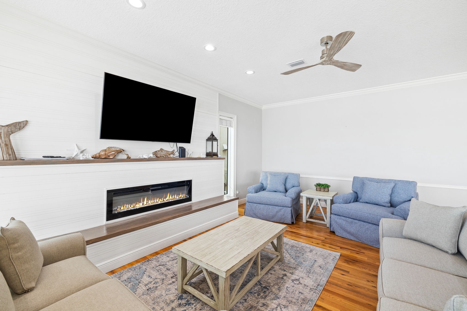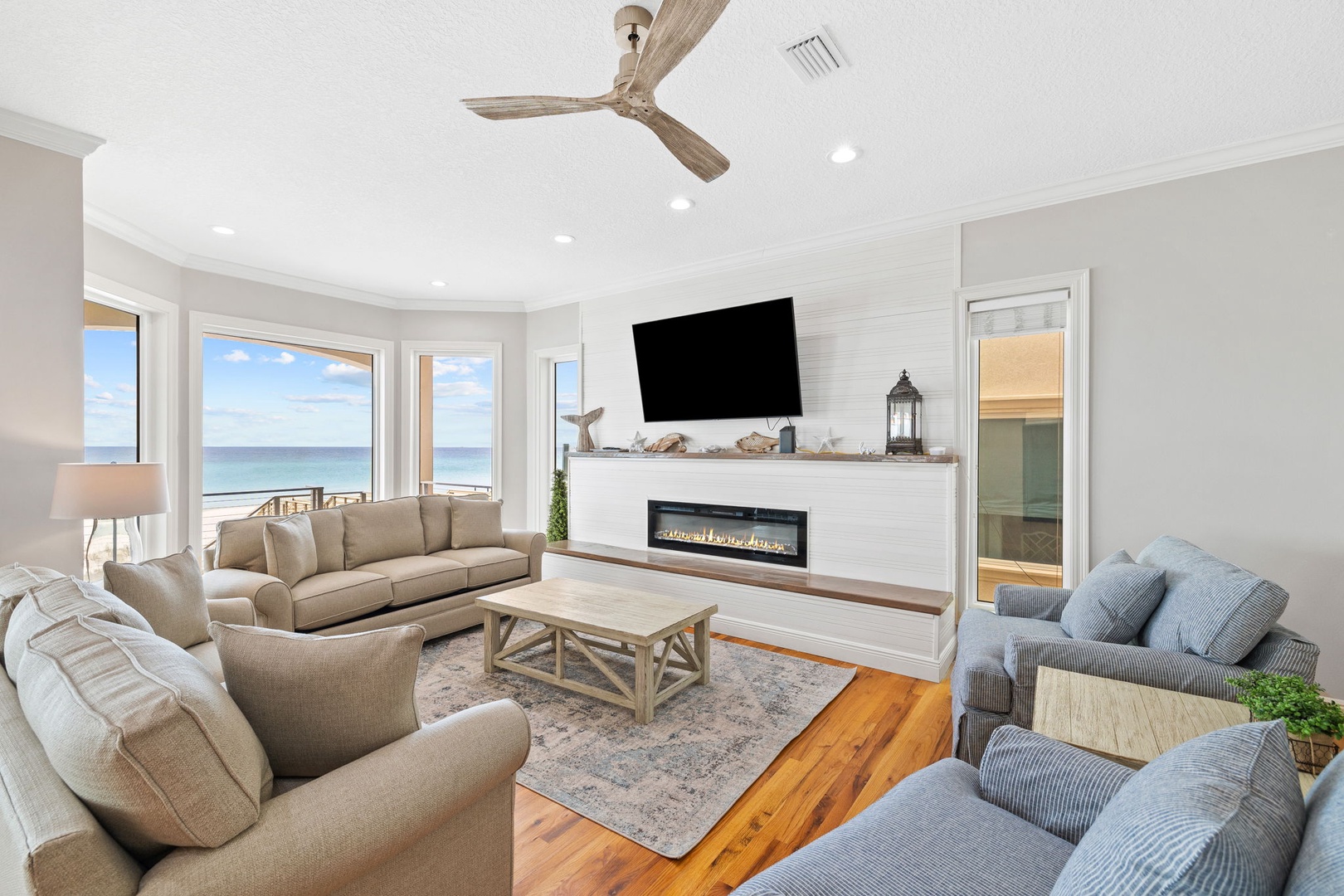 Light floods the first floor Great Room area through a wall of windows providing vivid views of the emerald-green waters beyond. Gleaming natural-tone hardwoods flow through the open concept area connecting two conversation and entertainment spaces. A modern electric fireplace and beautifully curated furniture pieces ground this inside spot and pair well with the covered balcony space and its luxury furnishings just outside. The dining area is defined by custom light fixtures, a luxury area rug, and a modern driftwood gray dining table with seating for eight.