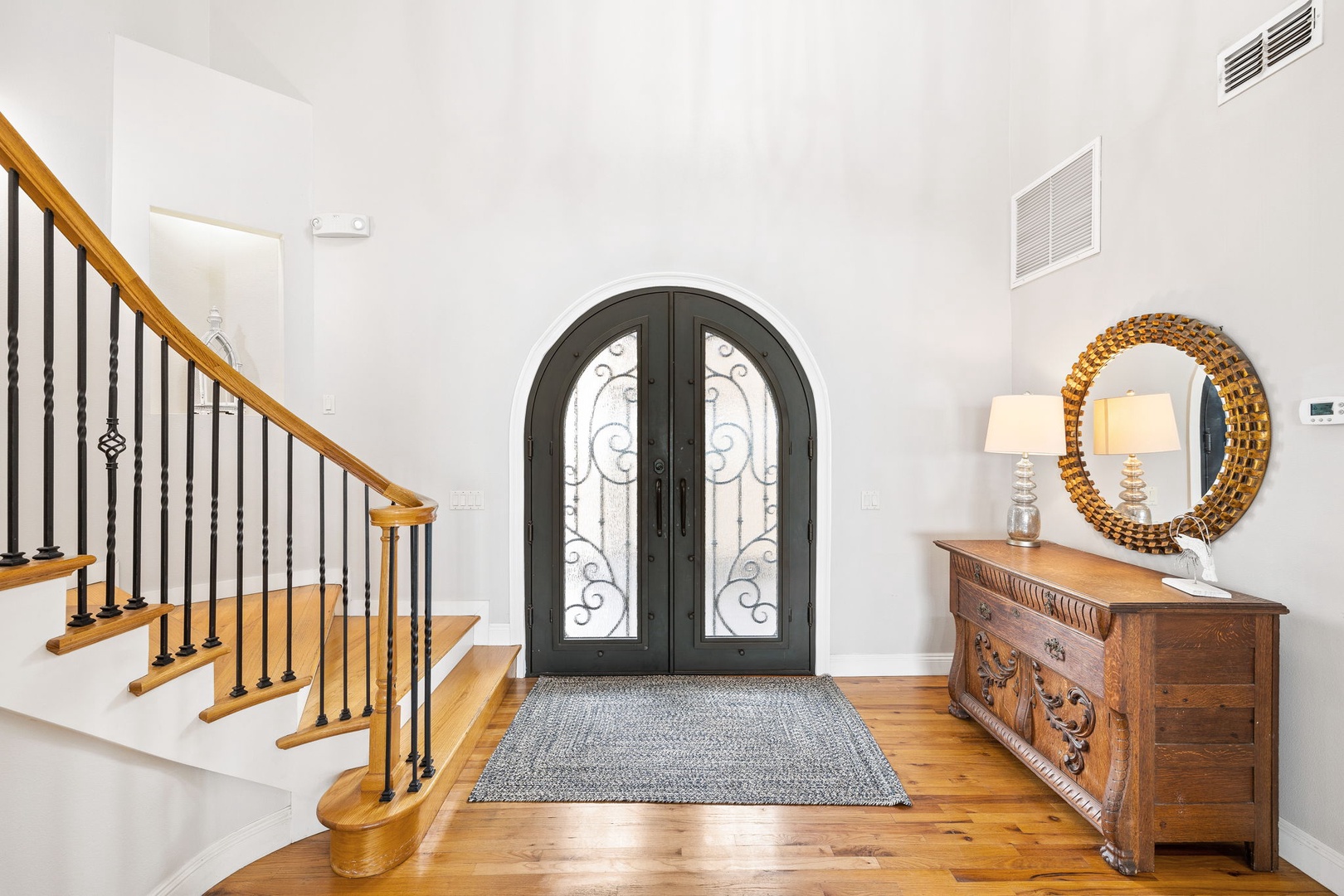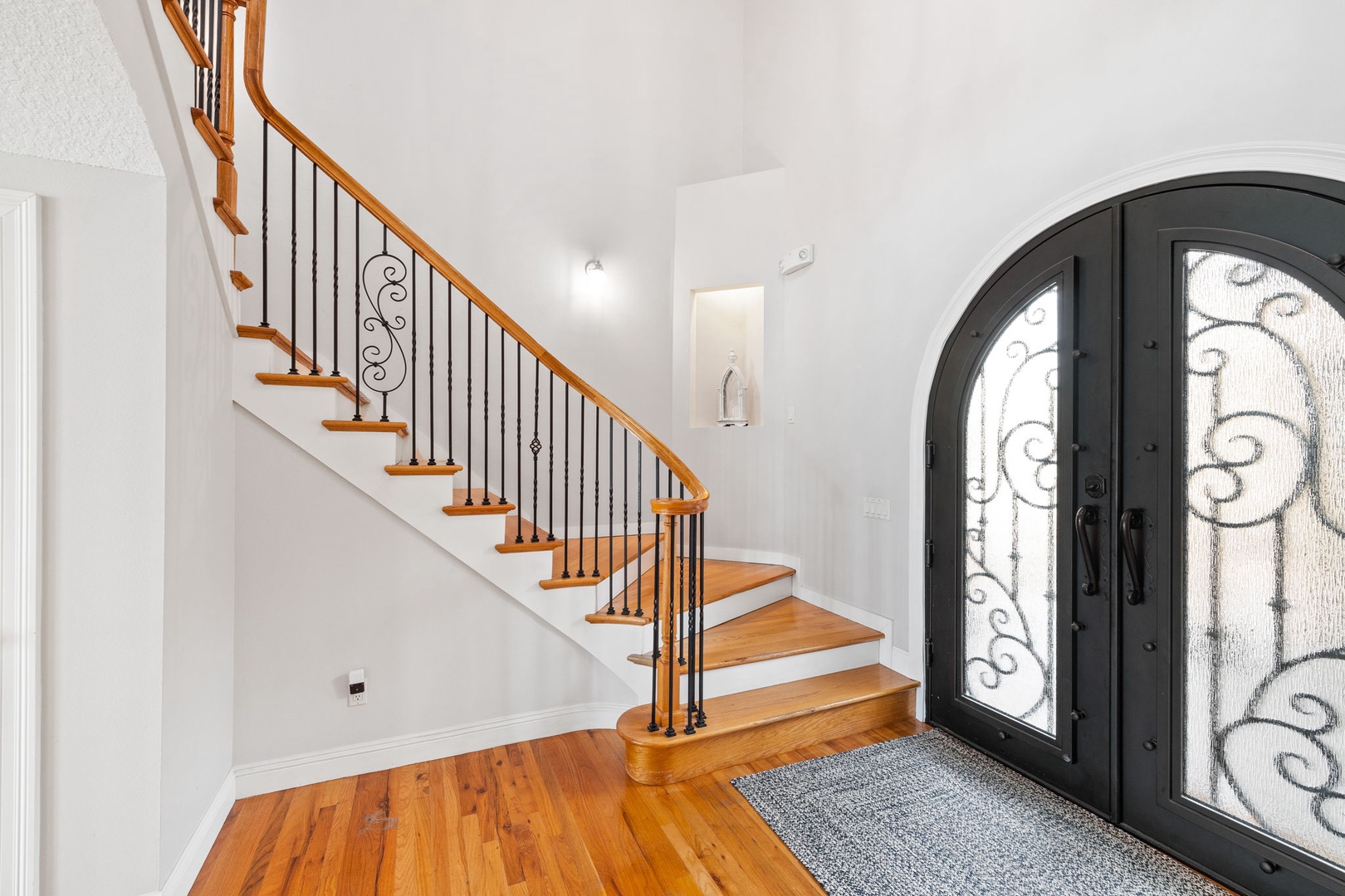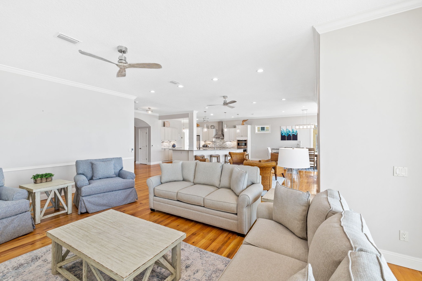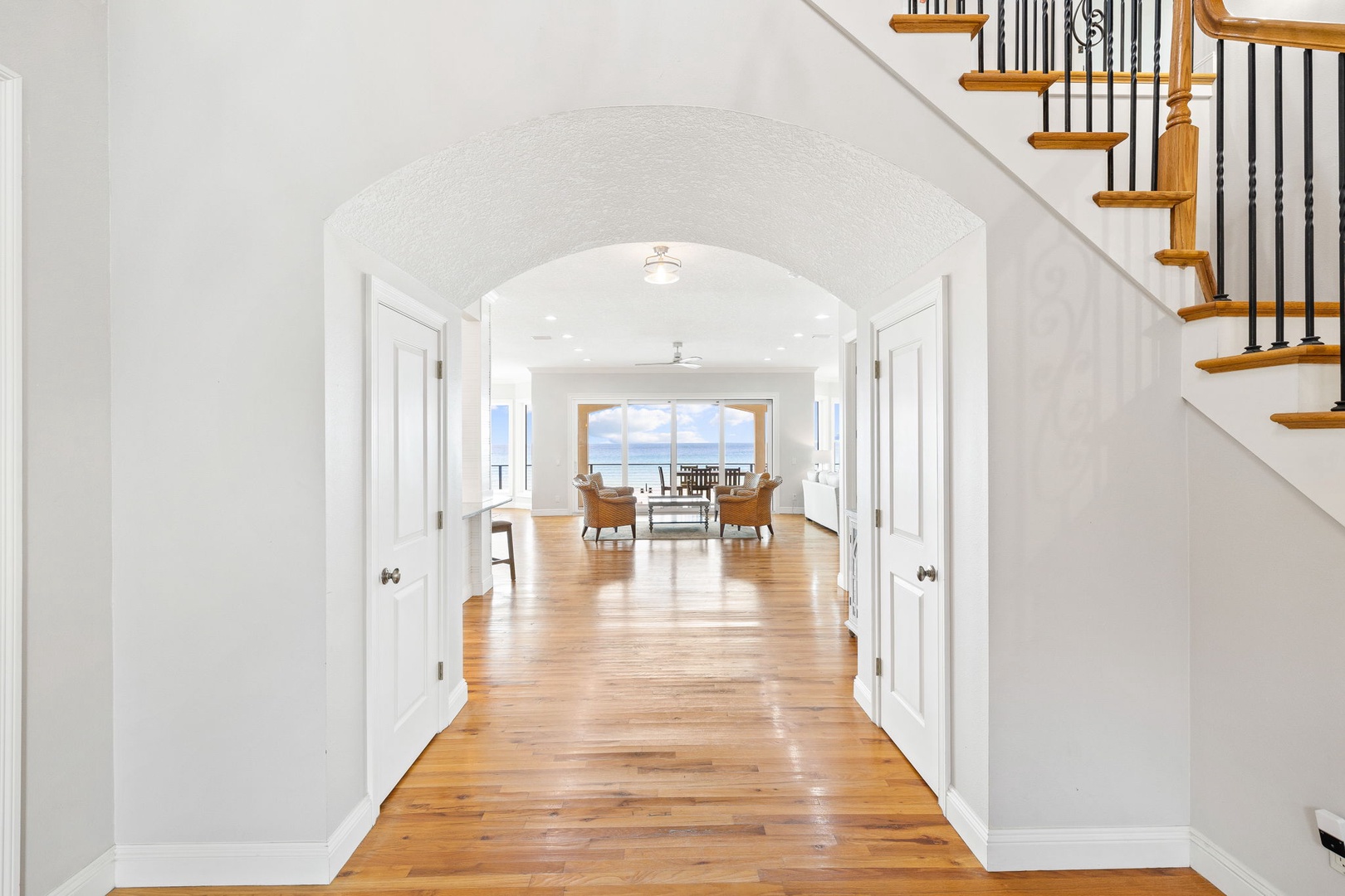 Light floods the first floor Great Room area through a wall of windows providing vivid views of the emerald-green waters beyond. Gleaming natural-tone hardwoods flow through the open concept area connecting two conversation and entertainment spaces. A modern electric fireplace and beautifully curated furniture pieces ground this inside spot and pair well with the covered balcony space and its luxury furnishings just outside. The dining area is defined by custom light fixtures, a luxury area rug, and a modern driftwood gray dining table with seating for eight.