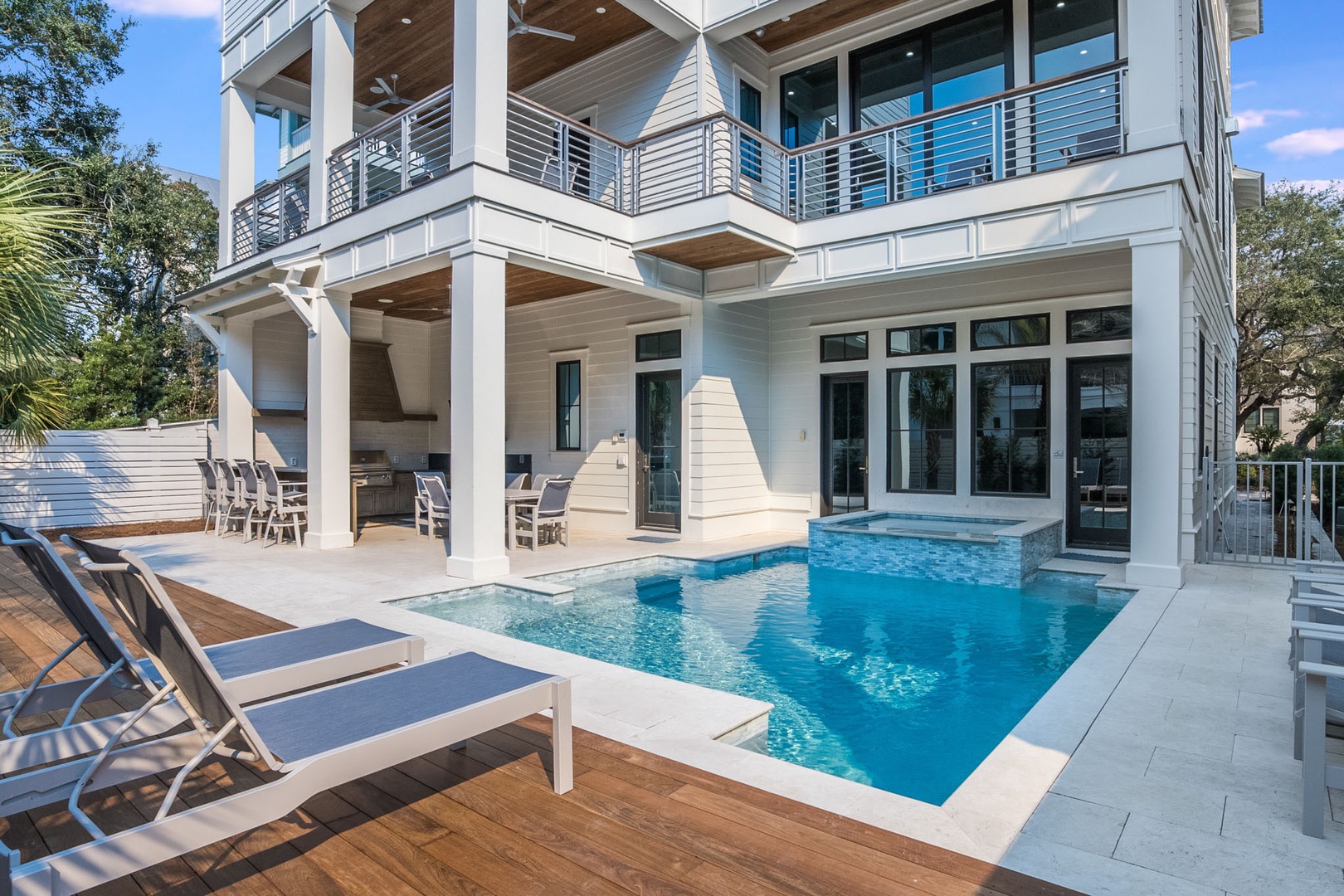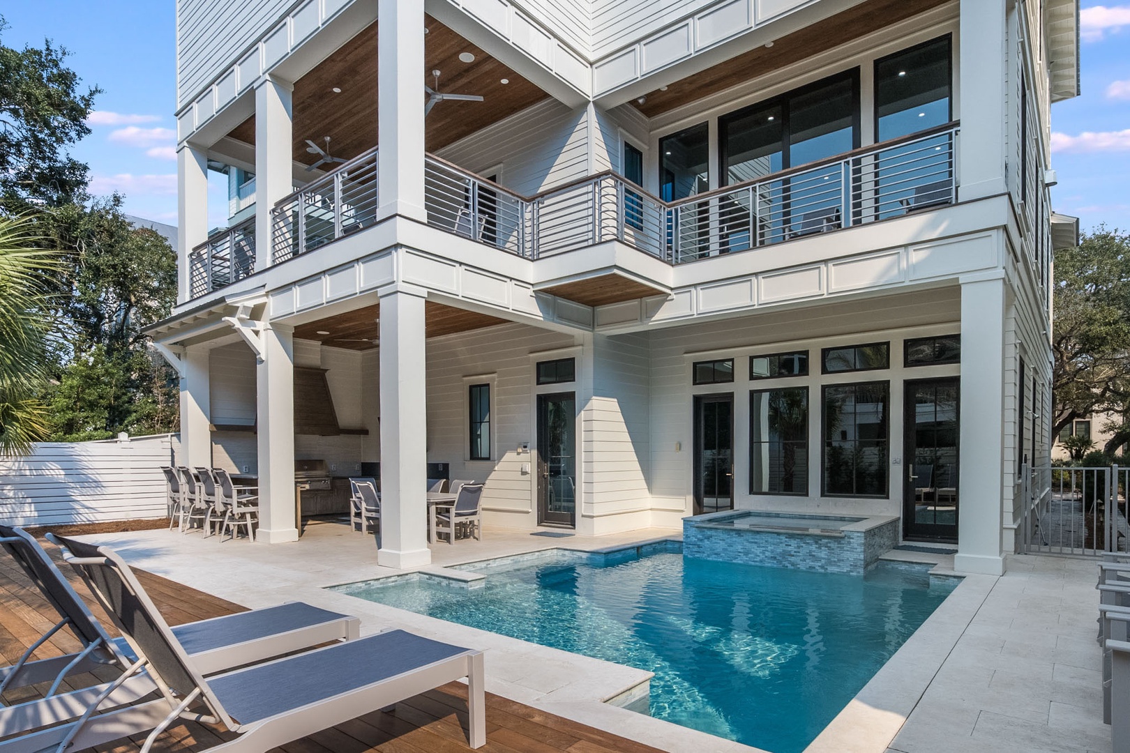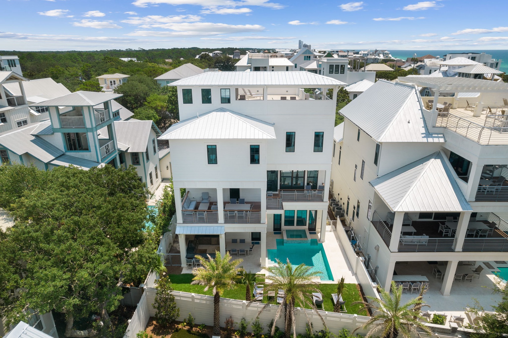 The third level thoughtfully offers guests comfort and privacy with the choice of an additional Master suite with a private bath featuring its own shower and soaking tub, three King suites with private tub and shower ensuites, and a Two-twin bedroom with private bath featuring tub and shower. As the day draws to a close, savor a glass of champagne on your private rooftop deck, taking in the breathtaking sunset that paints the sky with hues of gold and pink. This luxury beach rental property is not just a residence; it is a symphony of elegance, comfort, and modern beauty. Experience the epitome of coastal living where every detail has been meticulously curated to provide an unparalleled escape for the discerning traveler.