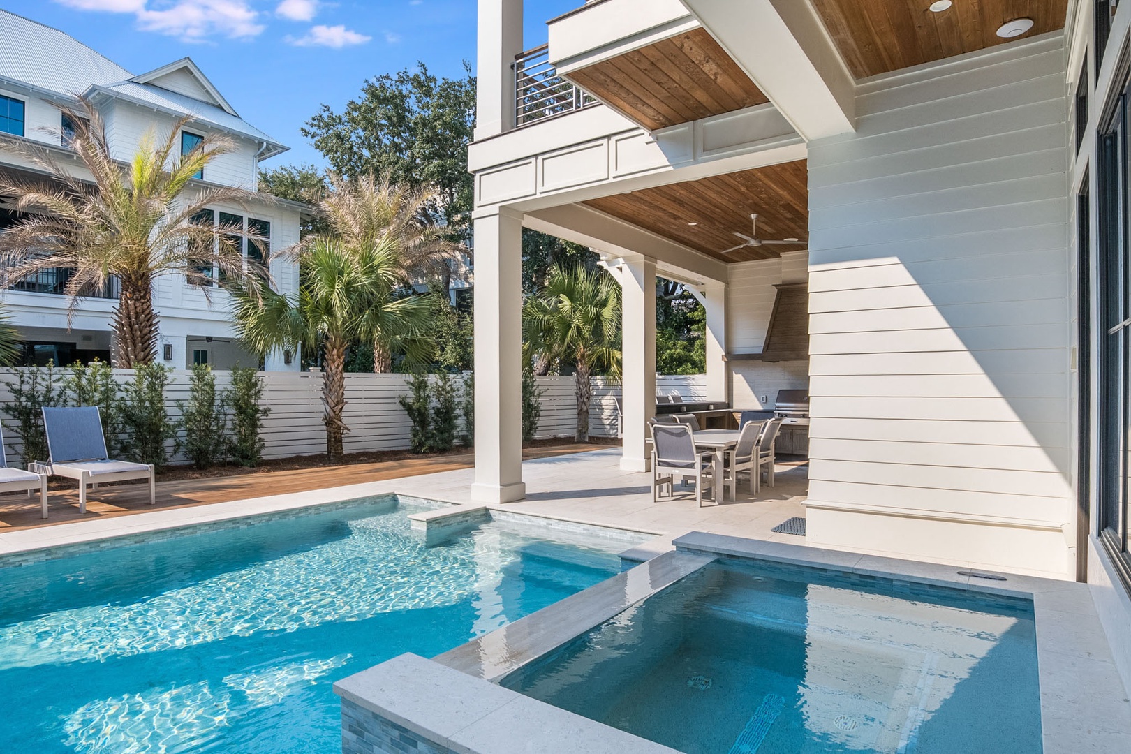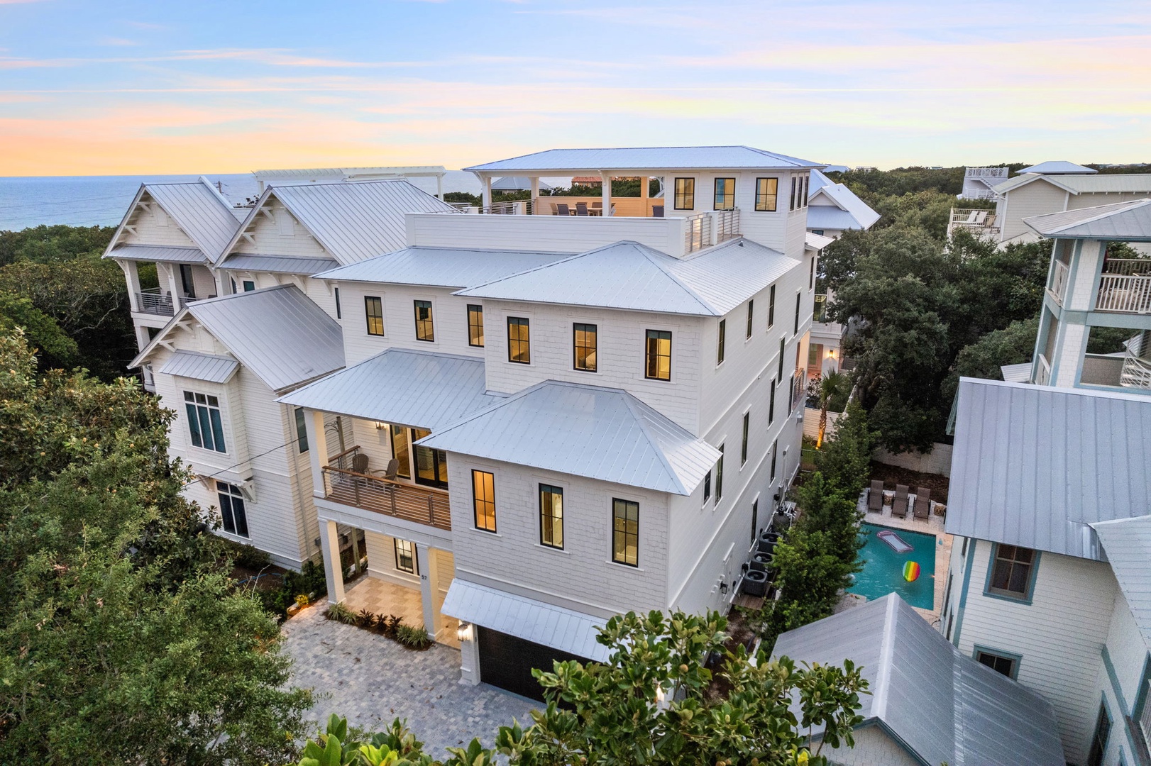 Beautifully nestled among the timeless oaks and stately magnolias of Old Seagrove, Drift Away 30A is an exquisite, newly constructed beach retreat offering the pinnacle of luxury coastal living. As the sun's golden rays dance on the turquoise waves just 250 steps away, you'll find yourself immersed in a world of opulence and tranquility. Features of this home include 8 bedrooms, 8.5 bathrooms, a private resort style pool, outdoor kitchen, dining and bar space, roof top deck with Gulf views, a game room, and elevator. Clever design pleases as you step into the first level family entertainment space with a large game room. Guests will enjoy a private retreat in the King bedroom with bath and shower, or the fun companionship in three Queen-over-Queen Bunks with shared shower.