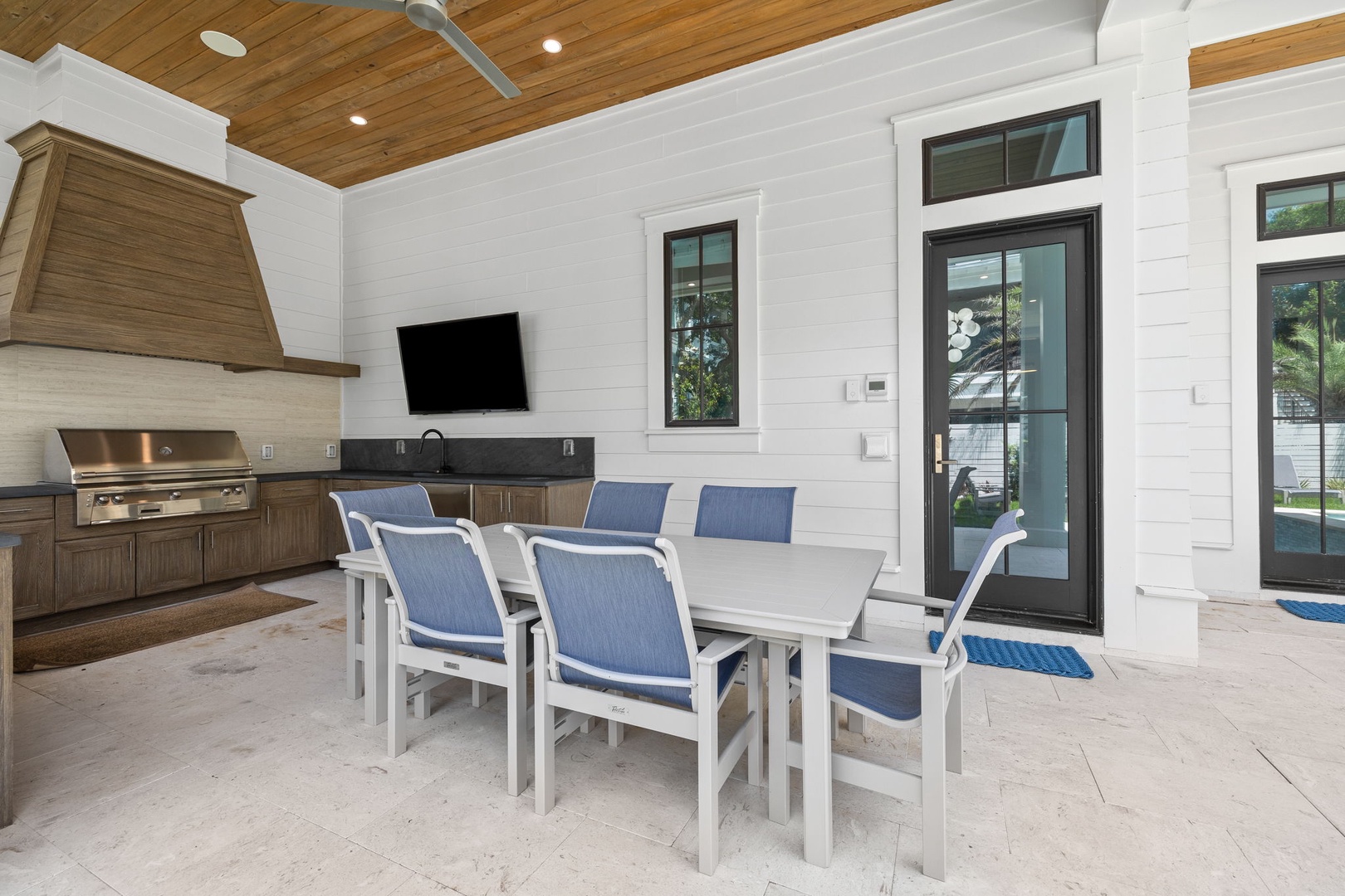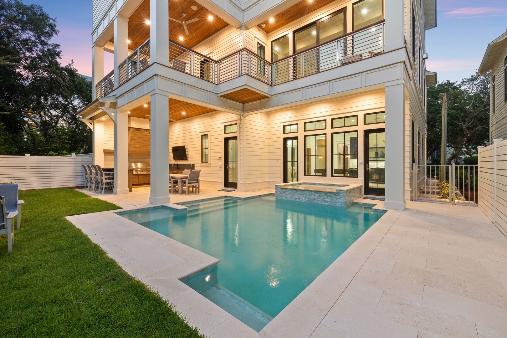 The second level boasts an open concept living area seamlessly blending timeless elegance with modern comfort. Relax on plush furnishings handcrafted for indulgence or gather around the fireplace as the gentle sea breeze whispers through. The gourmet kitchen is a culinary masterpiece, featuring top-of-the-line stainless steel appliances, a spacious marble-topped island, and custom cabinetry that exudes sophistication. Whether you're a culinary enthusiast or prefer the services of a private chef, this kitchen and dining spaces are poised to delight. Step outside onto the expansive terrace and let your senses be captivated as you overlook the crystal waters of the resort style pool and jacuzzi below, creating a visual masterpiece that is equally enchanting day and night. Unwind in the lavish primary suite, where a king-sized bed invites you to sink into its embrace. The ensuite bathroom is a spa-like haven, boasting a deep soaking tub, a rainforest shower, and pristine dual vanities. Additional guest space unfolds in Twin-over-Twin bunks.