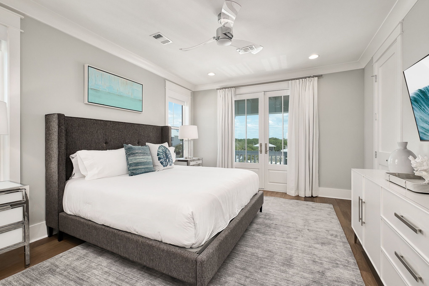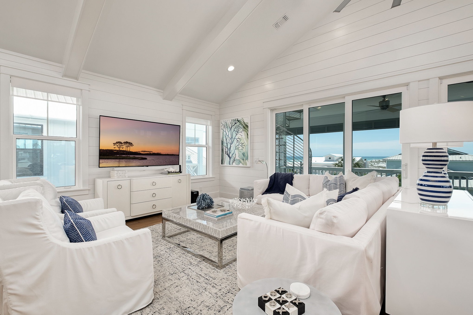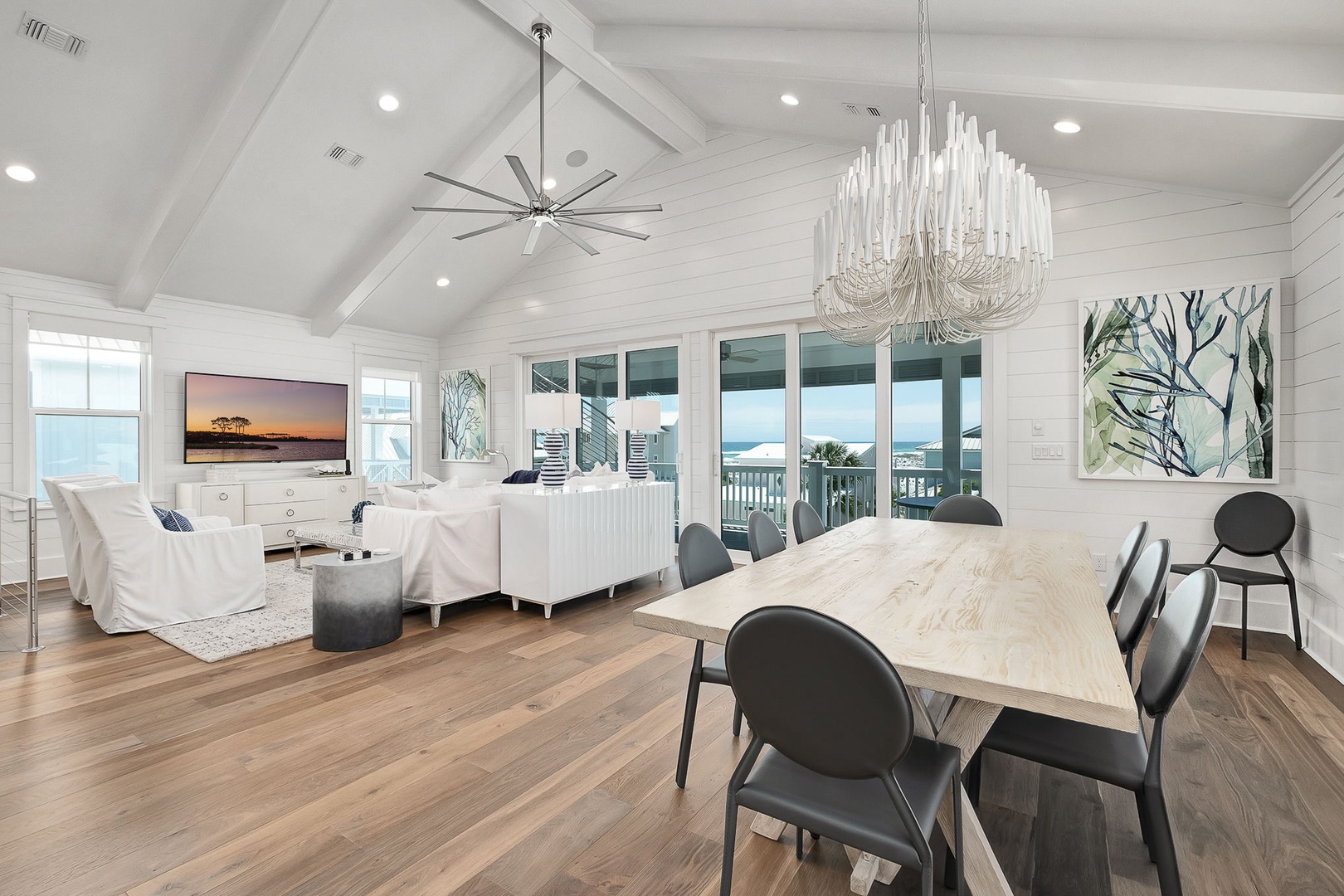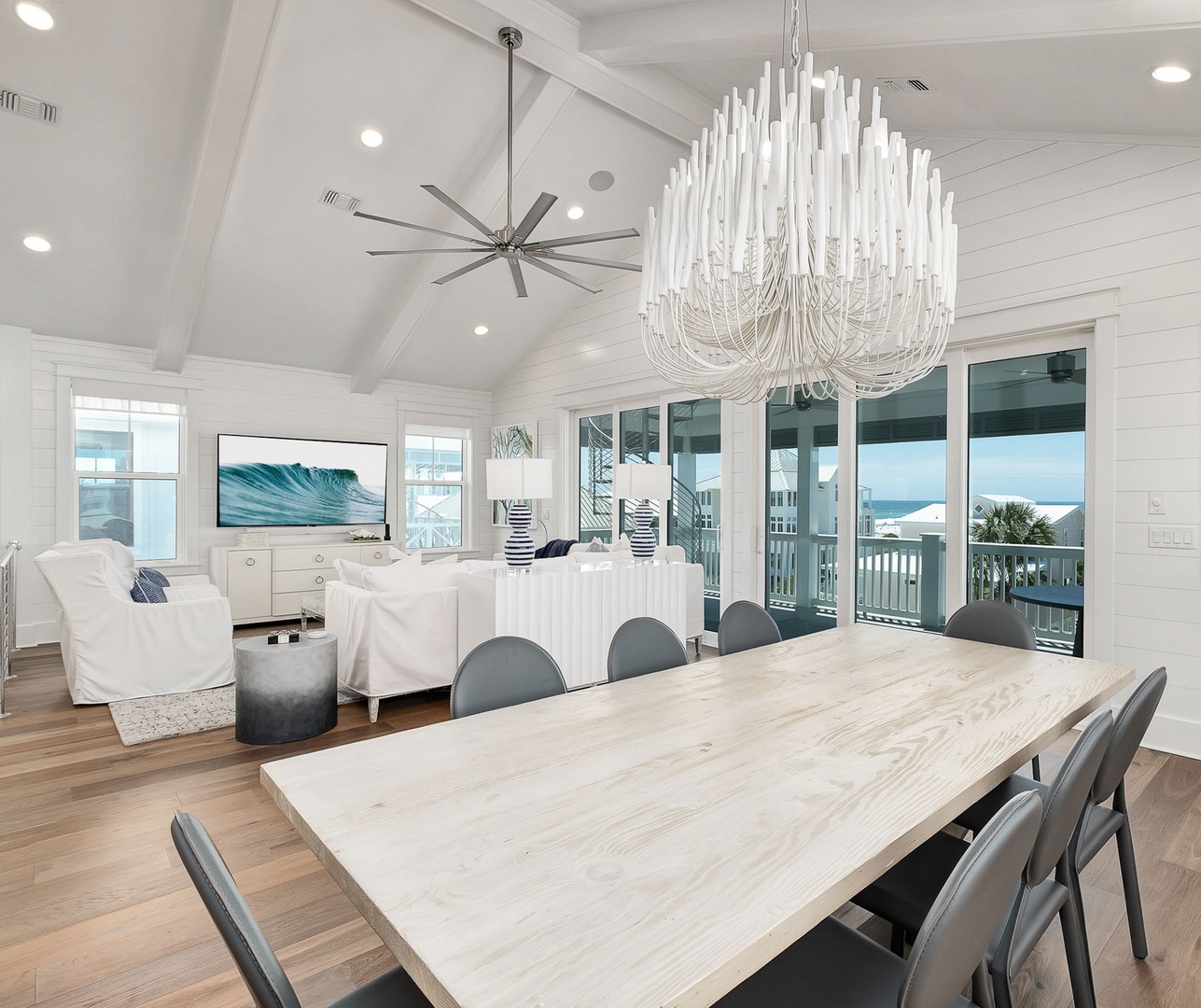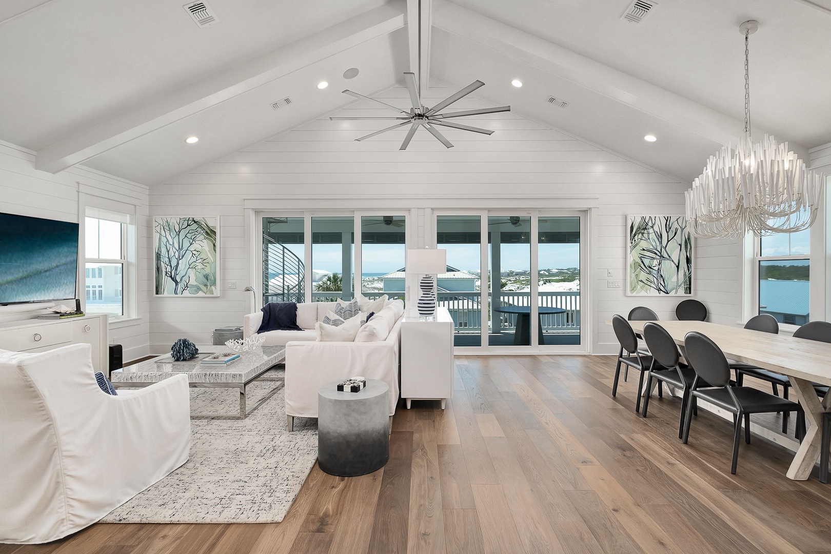The main living level is airy and inviting, with vaulted ceilings, a plush sectional, and an HDTV for movie nights. A farmhouse dining table anchors the space, while doors open onto a shaded balcony. For panoramic views, climb the spiral staircase to the rooftop perch overlooking the turquoise water.