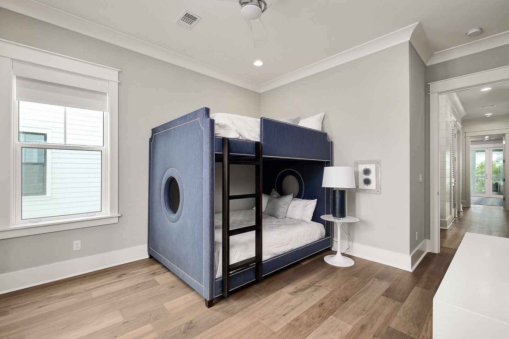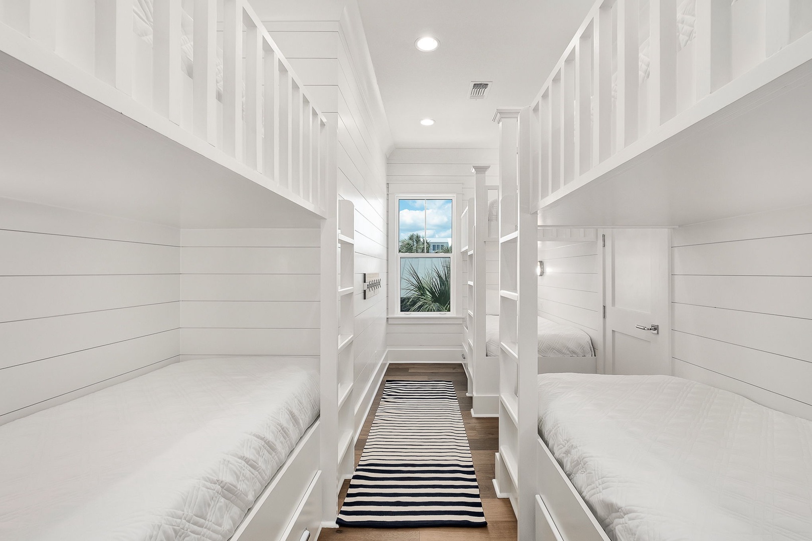 Inside, five thoughtfully designed bedrooms offer a mix of private king suites and versatile bunk spaces ideal for groups or families.