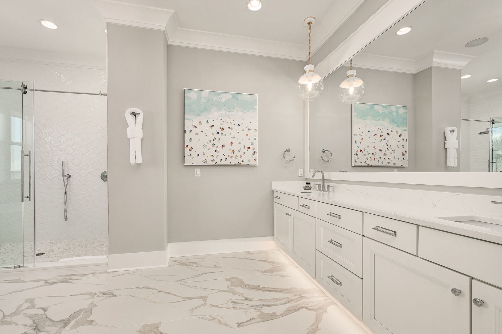 Outdoors, the covered lanai becomes an extension of the living space with lounge seating, a mounted TV, a built-in grill, and a crystal-clear pool, an ideal spot to unwind after a day at the beach.